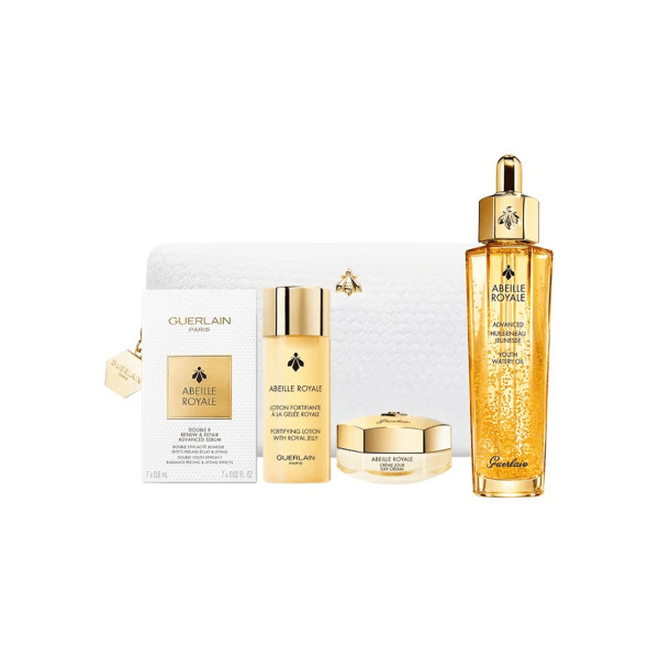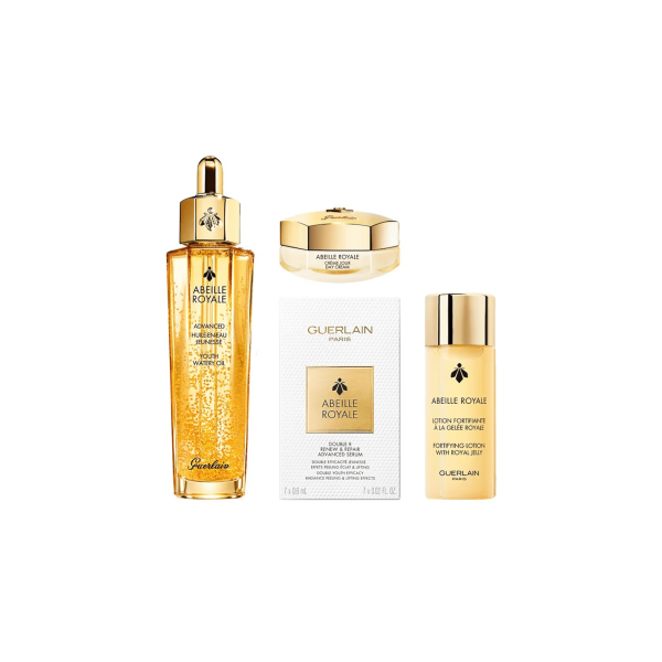 Composición del estuche:-Aceite Acuoso de Juventud Avanzado 50 ml -Loción Fortificante con Jalea Real 40 ml-Double R Renew & Repair Advanced Serum (7x0,6 ml) -Crema de Día 15 ml -Neceser El Aceite Acuoso de Juventud Avanzado y tres tratamientos complementarios reunidos en un cofre que ofrece un ritual de juventud enriquecido con el poder reparador de la juventud de la miel. El Aceite Acuoso de Juventud Avanzado combina los productos apícolas más potentes seleccionados por la Investigación Guerlain para ofrecer una reparación 9 veces más rápida¹. La piel se redensifica y parece visiblemente más joven. Su fórmula no grasa está compuesta por un 95 % de ingredientes de origen natural². La Loción Fortificante, 25 veces más concentrada en jalea real³ gracias a la microencapsulación, ayuda a la piel a resistir los efectos de diversos factores de estrés que alteran su calidad y su belleza. Diseñada para todo tipo de pieles, incluso las pieles sensibles, ayuda a restablecer su estado perfecto: la piel luce reequilibrada, hidratada, flexible y radiante. Double R Renew & Repair Advanced Serum combina el poder de dos tecnologías exclusivas para renovar la epidermis y ofrecer un efecto reafirmante a la piel con un solo gesto. La piel está más lisa y luminosa, y los poros minimizados. Las estructuras de la epidermis se vuelven a tensar para lucir un aspecto más juvenil. Formulado con un 96 % de ingredientes de origen natural. La Crema de Día Abeille Royale combina la tecnología BlackBee Repair con un derivado de vitamina C para reafirmar la piel, alisar las arrugas y las líneas de expresión y revitalizar visiblemente la luminosidad de la tez. Ha sido formulada para adaptarse a todo tipo de pieles, incluso las más sensibles. Su textura sedosa combina una suavidad extrema y un confort óptimo sin dejar una película grasa. Modo de aplicación: Paso 1: aplicar la loción por la mañana y por la noche sobre la piel limpia. Poner varias gotas en la palma de la mano y frotar ambas manos. Aplicar mediante suaves palmaditas sobre el rostro y el cuello. La piel queda perfectamente preparada para la aplicación de los tratamientos posteriores. Paso 2: agitar el frasco del Aceite Acuoso de Juventud. Tomar 2-3 gotas del aceite. Aplicar sobre rostro y cuello por la mañana y la noche. Paso 3: aplicar Double R Renew & Repair Advanced Serum sobre rostro y cuello por la mañana y la noche. Aplicar el producto con ambas manos a la vez desde la parte media del rostro hacia el exterior, partiendo del mentón, la nariz y el centro de la frente. Paso 4: la Crema de Día se aplica por la mañana. Aplicar la crema desde la parte central del rostro hacia el exterior.