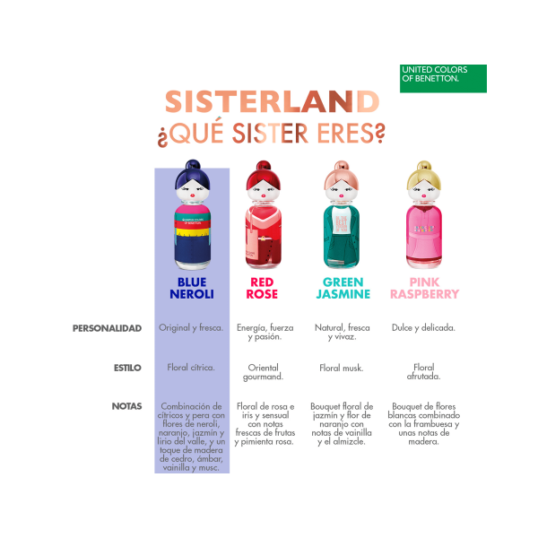 SISTERLAND es la nueva colección de fragancias de Benetton inspirada en la amistad femenina. Una amistad real e incondicional que consiste en abrazar todas aquellas cosas que nos hacen diferentes. WE ARE DIFFERENT, WE ARE FRIENDS. Desde el primer día te das cuenta de que ella es especial y tiene un súper poder: contagiar a todas su alegría y optimismo.Tipo de FraganciaFlorales, Cítricos & frutales NotasMandarina, Bergamota, Naranja, Pera, Flor de azahar del naranjo, Jazmín, Neroli, Lirio de los valles, Almizcle, Cedro, Vainilla, Ámbar