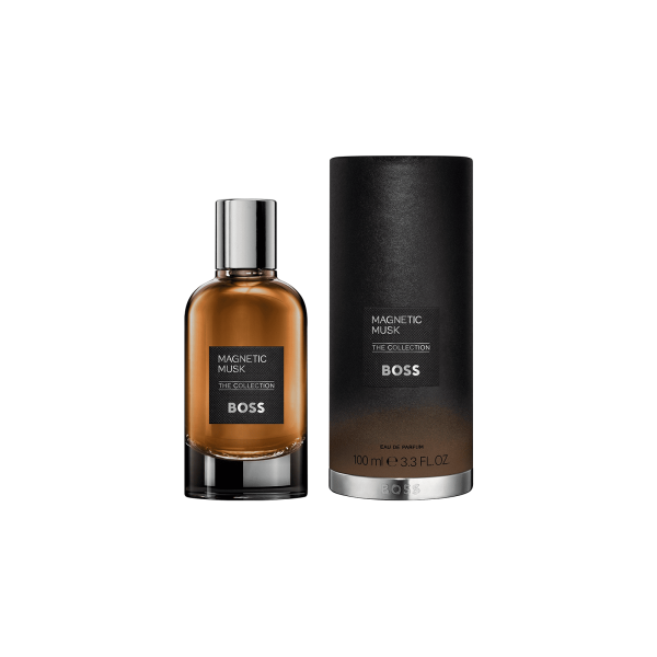 Un frasco de 100 ml de eau de parfum BOSS The Collection Magnetic Musk. Magnetic Musk captura la elegancia aterciopelada y la suntuosidad de un abrigo largo de cashmere. La infinita calidez del almizcle y el refinamiento de la salvia se combinan para ofrecer un efecto fluido y satinado, un rastro de seda que envuelve y acaricia la piel.