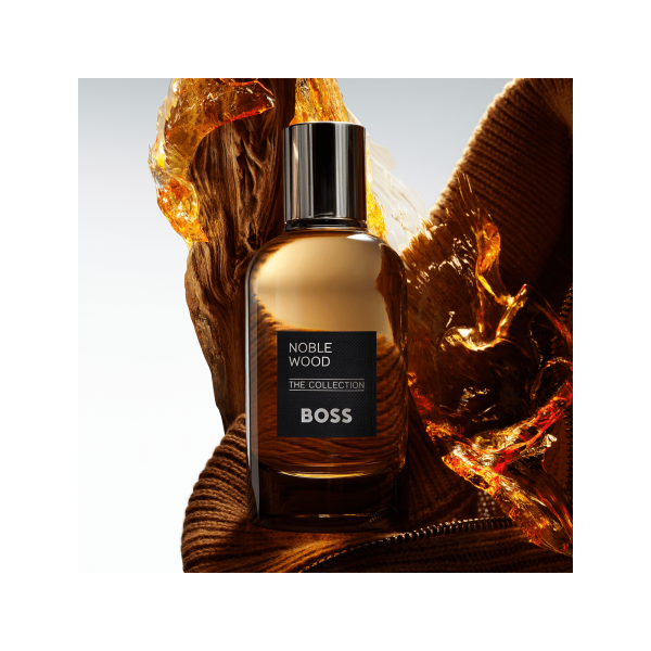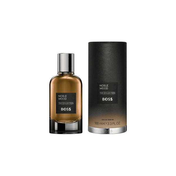 Un frasco de 100 ml de eau de parfum BOSS The Collection Noble Wood. Noble Wood se inspira en la finura del punto de cashmere para encarnar la esencia de la masculinidad moderna. La distinguida madera de roble, refinada como un jersey de cashmere, se realza con un acorde de whisky envejecido.