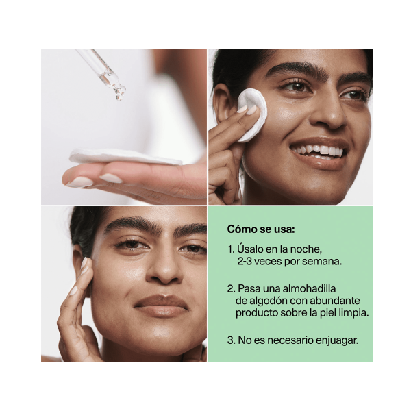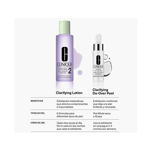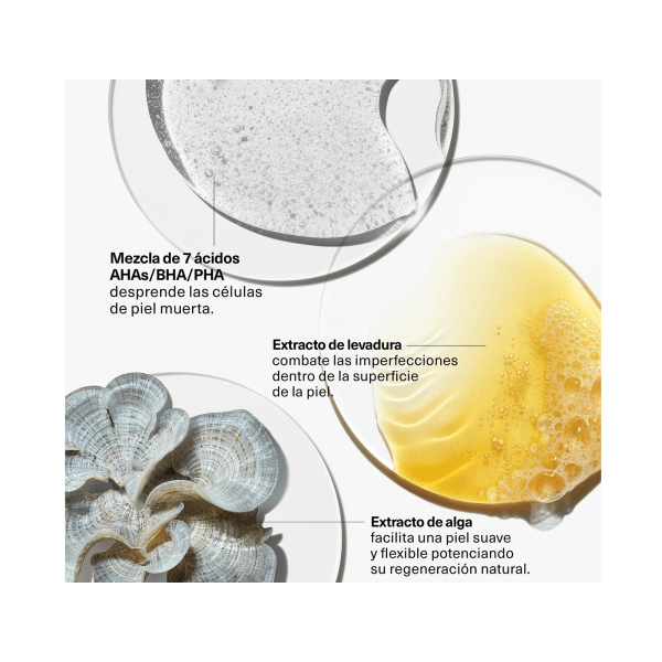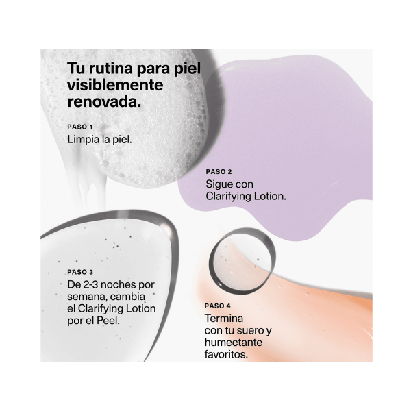 ¿Qué es?Con un exclusivo 32% Micro-Acid+ Complex, revela millones de células nuevas para una piel que se ve radiante y renovada.¿Qué hace?Esta exfoliación casera que no se aclara revela millones de células más frescas con cada uso. Con un complejo especial Micro-Acid+ al 32 %, estimula la renovación celular a través de una exfoliación de varios niveles, eliminando las células muertas de la piel que se acumulan en la superficie y trabajando profundamente en la superficie de la piel para ayudar a abordar futuras imperfecciones de manera temprana. Además de eliminar las células muertas de la piel, también elimina la suciedad y la grasa, que pueden obstruir los poros y provocar brotes. Deja la piel con un aspecto más radiante y renovado. Ayuda a mejorar la textura de la piel para que se sienta suave y tersa. Es el complemento perfecto para nuestro exfoliante instantáneo dos veces al día, Clarifying Lotion. Para una exfoliación de varios niveles, usa Clarifying Do-Over Peel 2-3 noches a la semana y luego en otras noches y todas las mañanas, usa Clarifying Lotion.Ingredientes claveUn exclusivo 32% Micro-Acid+ Complex contiene:Mezcla de 7 ácidos de AHA/BHA/PHA: ayuda a eliminar las células muertas de la piel que se acumulan en la superficie de la piel y hacen que la piel luzca opaca. La mezcla incluye ácido glicólico, ácido láctico, ácido cítrico, ácido tartárico, ácido pirúvico, todos alfa hidroxiácidos; ácido salicílico, un beta hidroxiácido; y ácido lactobiónico, un polihidroxiácido.Extracto de algas: ayuda a optimizar la renovación celular natural de la piel al promover la aparición de nuevas células frescas en la superficie.Extracto de levadura: un ingrediente fermentado rico en nutrientes que actúa profundamente en la superficie de la piel, lo que ayuda a optimizar el proceso de renovación celular natural de la piel para abordar las imperfecciones de manera tempranaResultados probadosDespués de 1 uso:* Despierta con una piel más radianteMejora el aspecto de la claridad de la piel.Después de usar durante 1 semana**: Las líneas finas se mejoran visiblemente.La textura mejora visiblemente, se ve más suave.Después de usar durante 4 semanas***: Los poros parecen menos perceptibles.*Pruebas clínicas en 30 mujeres después de usar el producto durante la noche.**Pruebas clínicas en 30 mujeres después de usar el producto durante 1 semana.***Pruebas clínicas en 30 mujeres después de usar el producto durante 4 semanas