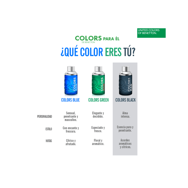 Las fragancias Colors nacieron para celebrar la multitud de colores de nuestro mundo. Benetton aboga por la libertad, la multiculturalidad y el optimismo invitando al mundo a aceptar todos los colores de piel desde el Black al Rose. Colors Black for Men comprende una rica y armoniosa diversidad de esencias. De los refrescantes cítricos en contraposición a las especias en las notas de salida, a un corazón aromático de suaves maderas y elegante cuero, terminando con un fondo de exótica madera, ámbar y musc. Black for him destaca gracias a las suaves curvas en negro de su botella cilíndrica adornadas con el punto de costura de Benetton. Tipo de FraganciaAmaderadosNotasPimienta, Nuez moscada, Bergamota, Cuero, Pachuli, Lavanda, Vetiver, Oud, Vainilla, Ámbar