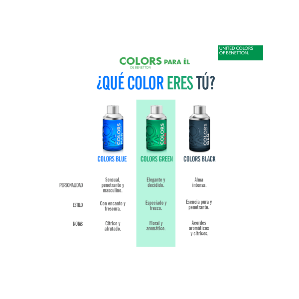 La colección de fragancias Colors destinada inicialmente para un público femenino, continúa su revolución del color ahora en un territorio masculino con el lanzamiento de Colors Man Green.La fragancia Colors Man Green se presenta como un perfume fresco a la vez que especiado. La mezcla de notas de salida aporta unos toques florales frescos que provienen de la bergamota, la pimienta negra y el especiado cilantro, proporcionando una sensación llena de tonos cítricos y de especias picantes. Estos dan paso a unas notas aromáticas procedentes del mirto para alcanzar los acordes finales del sensual ámbar con un fondo fresco proveniente del vetiver y de la madera de cedro. Porque cuanto más color, más diversidad.Tipo de FraganciaAmaderadosNotasBergamota, Cilantro, Cedro, Moras Azules