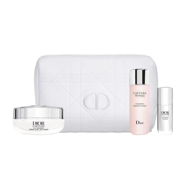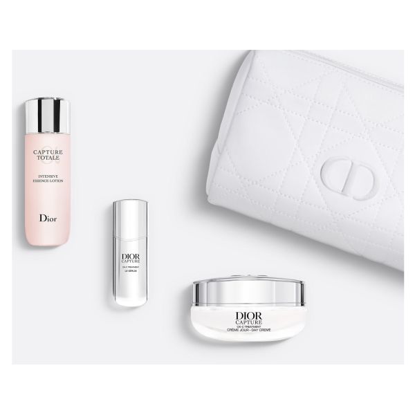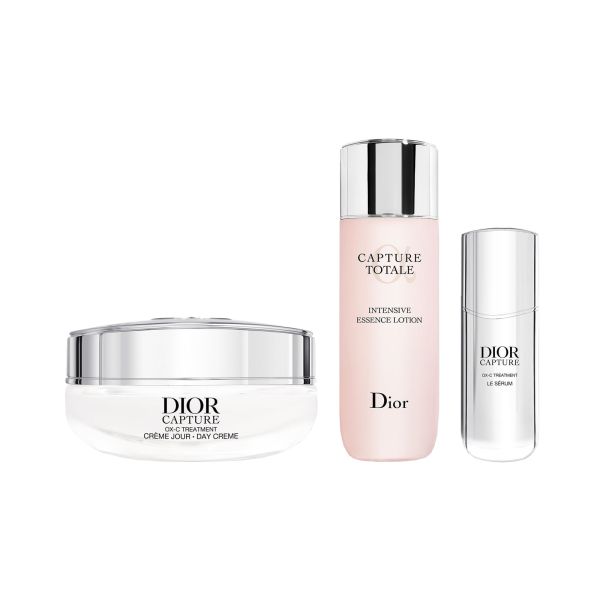 Consiga una piel visiblemente más firme y de aspecto más joven con este trío de tratamientos Dior Capture para rostro y cuello, que incluye las dos últimas incorporaciones a la colección. En 3 pasos, regala a tu piel los beneficios de un ritual corrector antiedad de alto rendimiento: - Capture Totale Intense Essence Lotion, 50 ml. La zona de rostro y cuello de la gama que prepara la piel para recibir otros tratamientos, unifica su textura y fortalece la barrera cutánea. Infundido con dos tipos de ácidos hialurónicos, suaviza visiblemente la piel y ayuda a recuperar su brillo original. - NUEVO Dior Capture The Serum, 10 ml. Su fórmula encapsula la tecnología OX-C Treatment con poder regenerador y rellenador, un extracto de lirio revitalizante y un dipéptido con propiedades densificantes. Tras su aplicación, el sérum proporciona a la piel un efecto tensor inmediato. Día tras día, el vello se suaviza y la piel aparece más firme, para un rostro visiblemente más joven. - NUEVA Crema de Día Dior Capture, 50 ml. Equipada también con tecnología OX-C Treatment con poder regenerador y rellenador, un extracto de lirio revitalizante y un dipéptido con propiedades densificantes, la fórmula de la crema diaria incorpora una combinación de polímeros y un dúo de ácidos hialurónicos para un efecto reafirmante y rellenador instantáneo.
