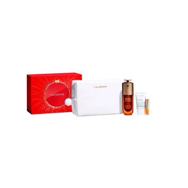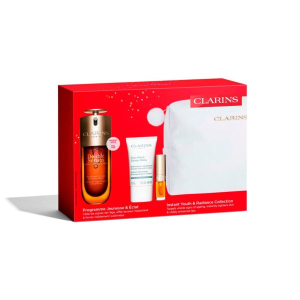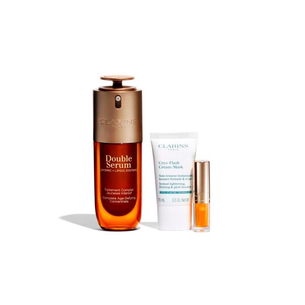 Este cofre se convertirá rápidamente en un imprescindible para un ritual de juventud y luminosidad cotidiano y reavivar las pieles apagadas o cansadas. El icónico Double Serum de nueva generación se centra en los diferentes signos de la edad. ¿El resultado? Arrugas visiblemente alisadas, una piel reafirmada, tersa y más luminosa. Para un efecto tensor instantáneo, el tratamiento Cryo-Flash Cream-Mask reduce la temperatura de la piel en -4°C*. La piel, inmediatamente reafirmada, está más radiante aplicación tras aplicación. Como complemento, el icónico Lip Comfort Oil, para unos labios brillantes y carnosos que se mantienen hidratados. Un bonito neceser con un 87% de fibras recicladas contiene estos productos. ¿Qué los hace tan especiales?- Combate los signos de la edad- Efecto tensor inmediato- Labios visiblemente sublimadosEste cofre contiene:DOUBLE SERUM (50ml) - El concentrado antiedad más potente- El concentrado antiedad más potente. Double Serum actúa sobre los signos de la edad relacionados con el envejecimiento natural, y por primera vez, ayuda a neutralizar el 100% de las causas biológicas del envejecimiento causadas por el estilo de vida. Cryo-Flash Cream-Mask 15ml- La mascarilla facial de alta eficacia, inspirada en la crioterapia, reproduce los beneficios del frío sobre la piel para prevenir y combatir los signos de la edad. Mini Lip Comfort Oil #01- Un nutritivo aceite con color para unos labios brillantes y realzados. Neceser Snow Clarins