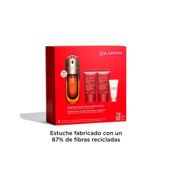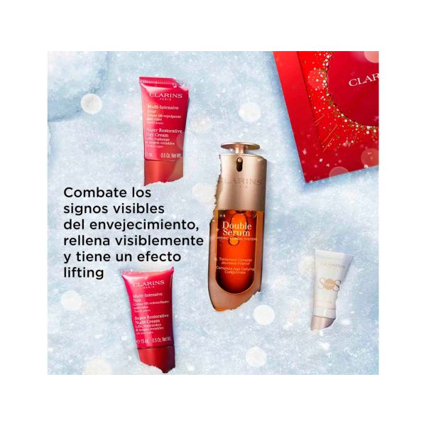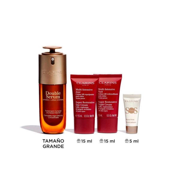 Es el cofre perfecto para las que quieren una piel de aspecto más joven, más lisa, reafirmada y con efecto lifting: primero, el Double Serum de nueva generación, tratamiento completo para actuar sobre los signos de la edad y un tratamiento indispensable de tu ritual de juventud, ya que traspasa las fronteras de la innovación antiedad y se reinventa en una nueva generación. A continuación, el dúo de cremas Multi-Intensiva Día y Noche redensificantes y alisadoras con extracto de harungana. Día tras día, la piel del rostro está más lisa, más densa, los contornos se remodelan y las arrugas se atenúan visiblemente. El último toque para una tez perfecta además de una piel reafirmada, el SOS Primer en miniatura, base iluminadora y potenciador de luminosidad. Prepara idealmente el maquillaje. Una bonita caja de regalo contiene estos productos: ¡dale una segunda vida según tus necesidades! Qué los hace tan especiales? - Combate los signos de la edad- Redensifica- Efecto liftingEste cofre contiene:DOUBLE SERUM (50ml) - El concentrado antiedad más potente- El concentrado antiedad más potente. Double Serum actúa sobre los signos de la edad relacionados con el envejecimiento natural, y por primera vez, ayuda a neutralizar el 100% de las causas biológicas del envejecimiento causadas por el estilo de vida. Multi-Intensiva Día 15ml- Super Restorative Day, 15ml Multi-Intensiva Noche 15ml- Crema de noche que recupera la densidad de la piel. SOS Primer White 5ml- La base de maquillaje que potencia la luminosidad de la piel al instante día tras día y mejora la fijación del maquillaje.