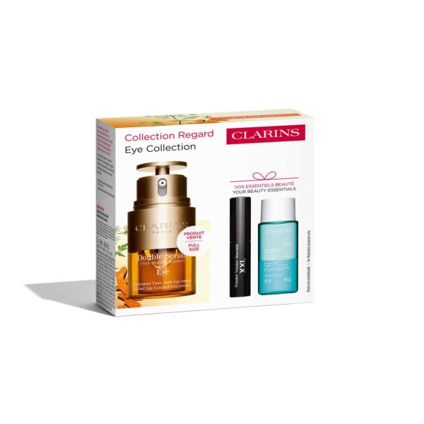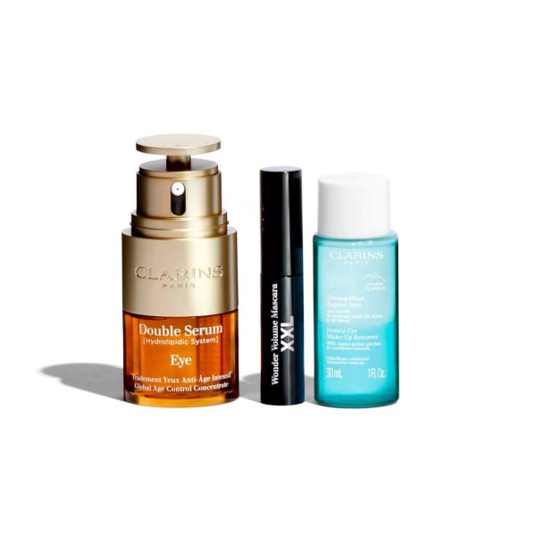 Tus tres esenciales para preservar la apariencia de la juventud y la belleza de la mirada. Un desmaquillante exprés suave con la piel, pero eficaz con el maquillaje. Double Serum Eye, el tratamiento antiedad para el contorno de los ojos con todos los beneficios de la tecnología de Double Serum. Su doble fórmula inédita tiene el poder de una gran variedad de plantas (13 extractos vegetales, entre ellos, el potente dúo de extractos de perifollo verde bio y cúrcuma): las arrugas se ven más lisas, las bolsas y las ojeras parecen atenuadas, y la mirada se ilumina. Y una máscara potenciadora del volumen para unas pestañas realzadas y una mirada intensificada. Tipo de piel: Mixta, Seca, Normal, Grasa¿Qué los hace tan especiales?Mirada radiante de juventud y realzada.
