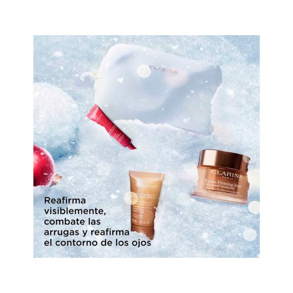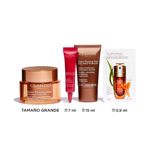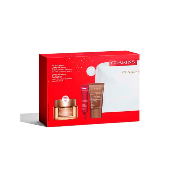 Este cofre experto es ideal para las mujeres que quieren una piel de aspecto más joven, lisa, reafirmada, como con efecto lifting: aplicar cada día la crema Extra-Firming Jour, recargable, con la nueva TECNOLOGÍA DE [COLÁGENO]³ (polipéptido de colágeno + extracto de pacana + extracto de Mitracarpus) para ayudar a mejorar la firmeza de la piel. Completa tu ritual de tratamiento con la crema Extra-Firming Nuit, que actuará durante las horas más adecuadas para la regeneración de la piel. Y para un contorno de los ojos reafirmado, el nuevo tratamiento Total Eye Lift contribuye a una mirada radiante de juventud. Se puede combinar con el icónico Double Serum de nueva generación, un tratamiento completo para combatir los signos de la edad. Un bonito neceser con un 87% de fibras recicladas contiene estos productos. ¿Qué los hace tan especiales?- Ayudan a reafirmar la piel- Reduce visiblemente la apariencia de las arrugas Efecto lifting de la miradaEste cofre contiene:Extra-Firming Jour para todo tipo de pieles- TECNOLOGÍA DE [COLÁGENO]³ INNOVADORA*. Crema con efecto lifting, alisa las arrugas, reafirma. 50 mlTotal Eye Lift trial size 7ml- Transforma tu mirada con un efecto lifting en 30 segundos* gracias al contorno de ojos más completo. Extra-Firming Night Cream All Skin Types Trial Size 15mlDouble Serum 9 Sach 0.9ml 2024- El concentrado anti edad más potente. Double Serum actúa sobre los signos de la edad relacionados con el envejecimiento natural, y por primera vez, ayuda a neutralizar el 100% de las causas biológicas del envejecimiento causadas por el estilo de vida. Neceser Navidad Clarins / Neceser pequeño