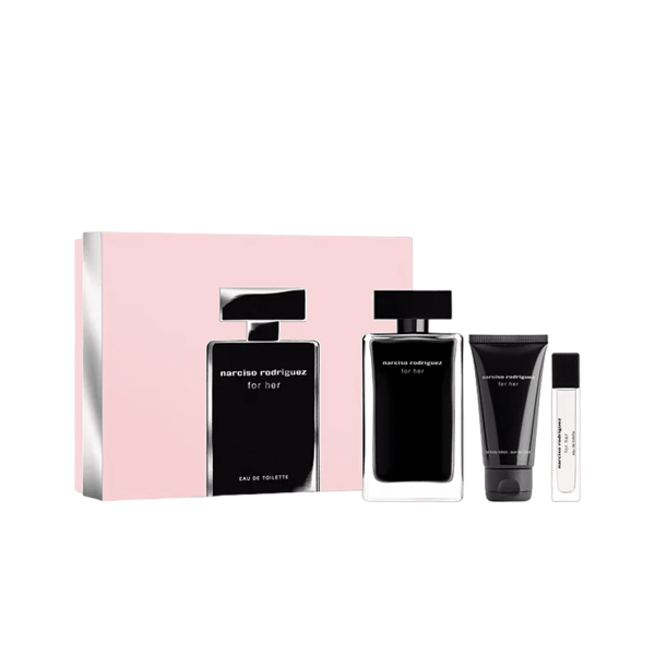 Narciso Rodríguez ilumina las fiestas con un extraordinario regalo. Un nuevo y fascinante material con un brillo metálico iridiscente ilumina nuestros sets especiales de perfumes de mujer para la temporada navideña.Déjese cautivar por el brillo resplandeciente de nuestros nuevos sets de regalo. Haz que esta Navidad sea extraordinaria con Narciso Rodríguez.Narciso Rodriguez For Her Eau de Toilette se estructura en torno a tres variaciones olfativas. Cálidas notas florales revelan el corazón de almizcle con acentos refrescados por la flor de naranjo y el osmanto. Las notas de 'luz ámbar' transportan el almizcle a un registro más abstracto, donde su suavidad se vuelve envolvente. El ámbar y la vainilla aportan una riqueza cremosa al radiante núcleo de almizcle. Las notas amaderadas ayudan a que la dimensión sensorial del almizcle se desarrolle por completo. El vetiver se vuelve más femenino y la sensualidad de las notas amaderadas se intensifica para crear una estela duradera y adictiva.Menos es más con la caja 100% cartón. Narciso Rodríguez ha renovado el diseño de sus envases para reducir su impacto medioambiental. Te animamos a darle una segunda vida a tus cajas regalo reutilizándolas o reciclándolas.El juego contiene:-For her Eau de Toilette, 100 ml-Loción corporal For her, 50 ml-For Her Eau de Toilette 10 ml
