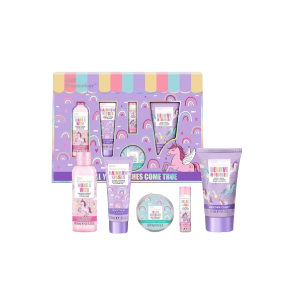 Cuernos de unicornio, relucientes frascos iridiscentes, sentimientos positivos y dulces aromas de ensueño, esta encantadora colección de baño está salpicada de fragancias dulces y afrutadas que aportan una sensación de magia al ducharse, frotarse las manos o sumergirse en una bañera. Extiende esas alas de unicornio y sumérgete en un baño de burbujas de ensueño o date una ducha persiguiendo arcoíris.Sea como sea, déjate llevar Beauticología.El kit de belleza perfecto que contiene 70 g de sprays de baño, 60 ml de crema de ducha, 50 ml de gel de baño, 30 ml de crema de manos y 5 g de bálsamo labial perfumado.