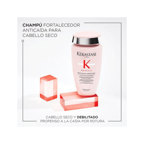 Baño fortificante para cabello de normal a seco debilitado con tendencia a la caída por rotura del cepillado.Beneficios del producto-Limpia suavemente el cuero cabelludo y el cabello a la vez que hidrata.-Aporta una nutrición intensa y desenreda suavemente el cabello.-Evita el riesgo de caída del cabello por rotura del cepillado. 92% menos de caída del cabello por rotura del cepillado*.65 % más de suavidad/acondicionamiento** Genesis no es un producto anticaída. * En lugar del baño no acondicionador.