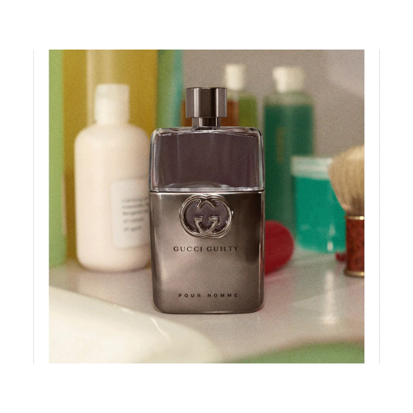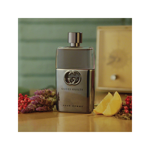Rompiendo las reglas de elaboración tradicional de fragancias masculinas, el corazón femenino y sensual de flor de naranjo de Gucci Guilty Pour Homme es reforzado con notas seductoras de lavanda francesa y pachulí. Notas Lavanda, Limón, Flor de naranja, Madera de cedro y Pachulí Familia de fragancias Frescos