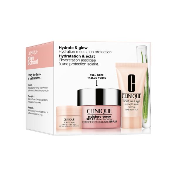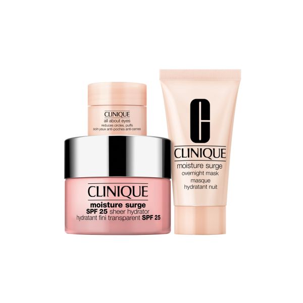 3 productos favoritos para la hidratación de la piel, incluida una crema hidratante con SPF. Mantente hidratada y protegida con tres productos para el cuidado de la piel: una crema hidratante con SPF para la mañana, una mascarilla hidratante para la noche y una crema para el contorno de ojos. Hidratante Moisture Surge SPF 25 Sheer es un hidratante ligero y cremoso que proporciona hidratación y protección solar ligera, incluso para los tonos de piel más oscuros. Protege de los rayos UVA/UVB para evitar que la luz del sol apague la de tu piel. Mascarilla de noche Moisture Surge alivia y nutre con hidratación mientras duermes para una piel hidratada y resplandeciente al despertar. Crema-gel All About Eyes hidrata y ayuda a reducir visiblemente las bolsas y las ojeras con su uso continuado.