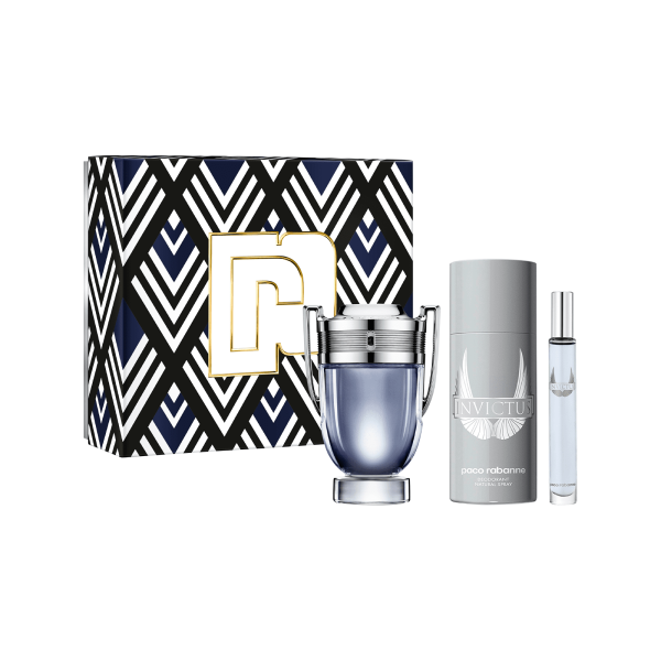 En este estuche de regalo con el icónico estampado de Paco Rabanne. Un choque olfativo entre maderas viriles y una ráfaga de brisa marina. ¡La fragancia de la victoria!Invictus representa al hombre con todo su poder, el héroe absoluto. Desafiado y bendecido por los dioses. Su perfume es el de la victoria. Invictus eau de toilette representa el enfrentamiento entre una frescura penetrante y una sensualidad animal. Dos fuerzas que nada (ni nadie) puede resistir.Contenido-Eau de Toilette 100 ml-Desodorante 150 ml-Spray de viaje 10 ml
