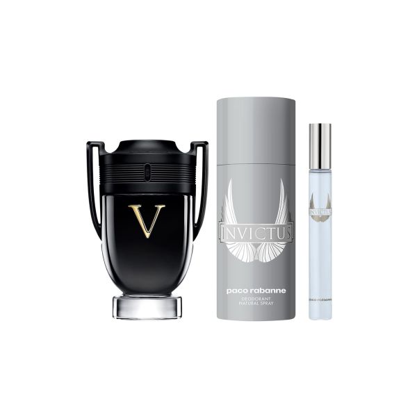 La eau de parfum extrema Invictus Victory de Paco Rabanne un perfume para hombre que provoca un auténtico choque de sentidos. En este intenso duelo, dos fuerzas se desafían frescura y sensualidad. Paco Rabanne reúne dos exclusivas para garantizar un efecto de larga duración. Una declaración sorprendente con un suplemento de frescura la vivacidad del limón recubierta por un todopoderoso incienso. Set Incluye: - Eau de Parfum 100ml - Desodorante 150ml - Perfume de Bolsillo 10ml