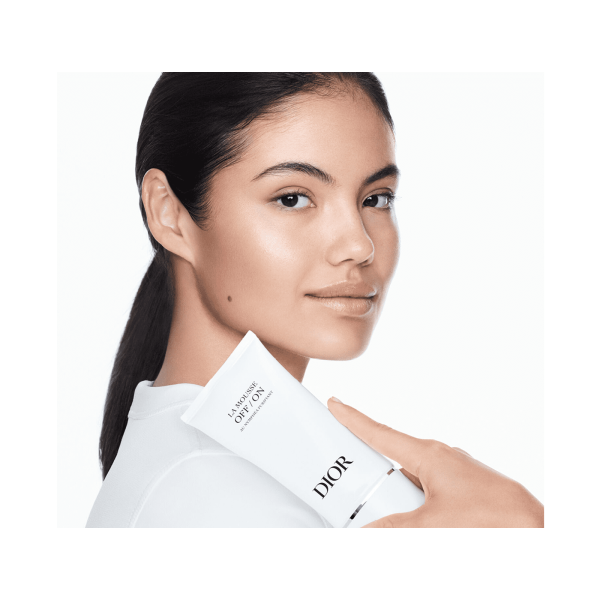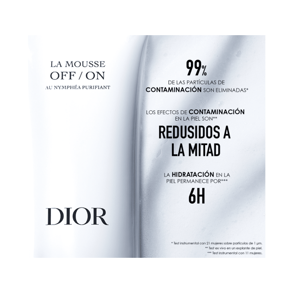 ¡HORA DE CAMBIAR! Dior ha creado OFF/ON Foaming Cleanser, la espuma limpiadora compuesta por un 90 % de ingredientes de origen natural para limpiar tu piel OFF/ON: - OFF = elimina las impurezas, las partículas urbanas, los restos de maquillaje y el exceso de sebo. Eficacia clínicamente probada: la espuma limpiadora elimina el 99 % de las partículas, incluidas las más finas y reduce en un 20 % los efectos de la contaminación sobre los lípidos cutáneos - ON = alivia la sensación de malestar, preserva la hidratación y la función barrera de la piel . El limpiador en espuma le permite reducir a la mitad los efectos nocivos de la contaminación en un marcador de barrera de la piel. Con una infusión de nenúfar purificante del nuevo jardín Dior y agua floral calmante de aciano, el limpiador en espuma OFF/ON ofrece más que una simple limpieza: este limpiador facial combina la suavidad de una crema con la eficacia de una espuma. Limpiador para revelar la pureza de la piel mientras proporciona una acción de cuidado de la piel que respeta la piel. Aireado y delicado, el limpiador en espuma OFF/ON libera la piel de residuos de maquillaje, filtros UV y contaminación para cambiar a una piel que parece increíblemente pura.TexturaMás que una simple limpieza, regálate un verdadero momento de cuidado con el limpiador OFF/ON: Su fórmula, compuesta por un 90% de ingredientes de origen natural, contiene un doble jabón que combate una amplia gama de impurezas. Su textura cremosa y densa se transforma en una espuma rica y aireada al entrar en contacto con la piel. Después del aclarado, la piel aparece perfectamente limpia, pura y confortable.