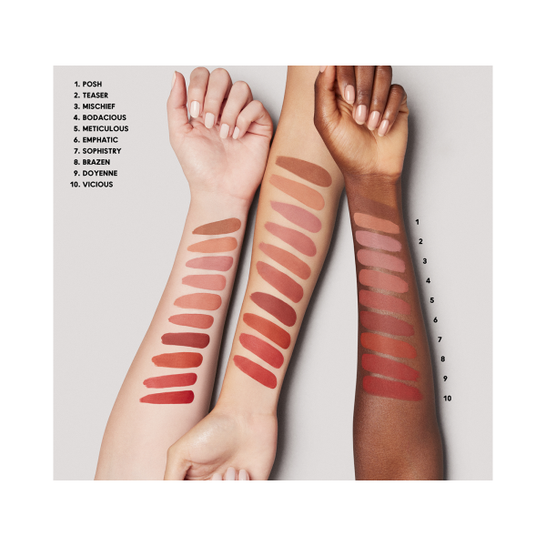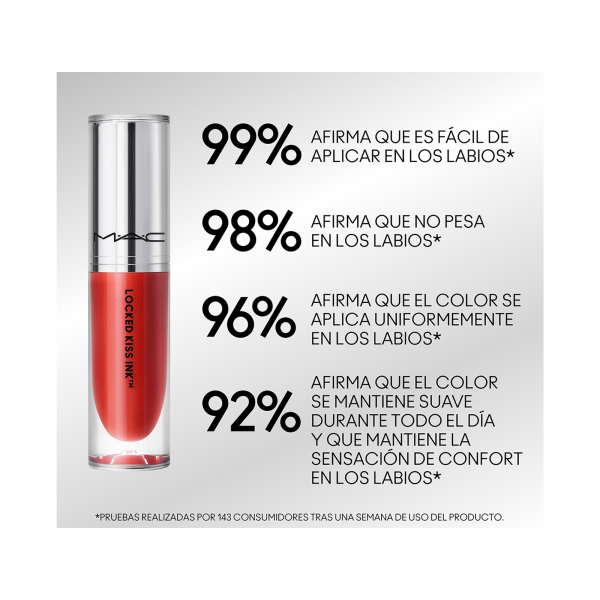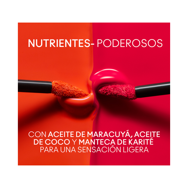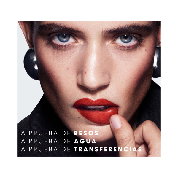 Colour: locked. Comfort: loaded. Consigue 24 horas de color sin limites con nuestra fórmula líquida a prueba de besos, transferencia y agua. Nuestra exclusiva tecnología "Pigment Lock" cuenta con pigmentos ultra finos de doble capa que envuelven suavemente los labios con un velo imperceptible, flexible y transpirable de color intenso mate y de cobertura total. Esta fórmula es buena para los labios ya que está enriquecida con aceite de maracuya, aceite de coco y manteca de karité para una sensación de confort casi impercitible. No se corre, no se difumina y no necesita retoque. Su aplicador de precisión inclinado y cónico dosifica sin esfuerzo los labios con un color liso, intenso y uniforme, con una punta fina que proporciona una precisión experta y una aplicación controlada. Nuestro labial líquido más duradero hasta la fecha se presenta en un lujoso empaque de alta tecnología. Además, ¡es tan fácil de poner como de quitar! -A prueba de besos, a las transferencias, de agua y al roce natural. -Mask-friendly; larga duración y a prueba de transferencias -Larga duración, hasta por 24 horas -Color intenso, hasta por 24 horas -Resistente a las manchas, a las comida y a la acumulación, 24 horas -No mancha, no hace pelusa, no se corre, 24 horas -El 99% afirma que es fácil de aplicar en los labios. -El 98% afirma que no pesa en los labios. -El 96% afirma que el color se aplica uniformemente en los labios. -El 92% afirma que el color se mantiene suave durante todo el día y que mantiene la sensación de confort en los labios