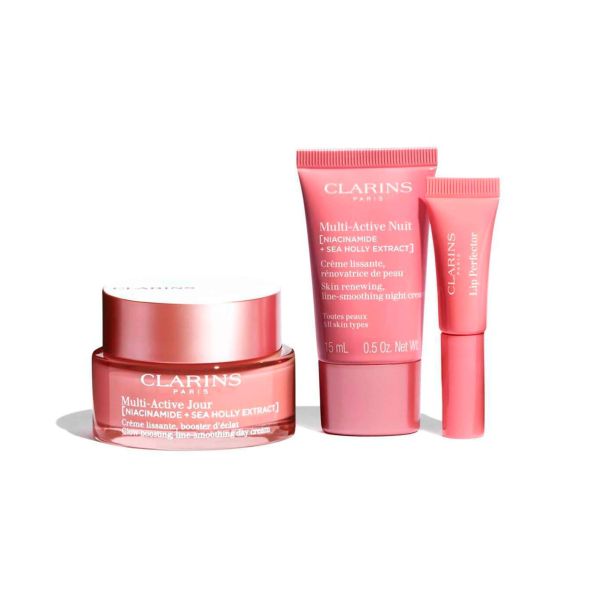 El cofre con tratamientos para las primeras arrugas de las mujeres activas que quieren proteger su piel de los efectos nocivos de un estilo de vida intenso. Dos cremas para preservar la juventud, una de día y otra de noche, formuladas con un extracto de cardencha que ayuda a atenuar la apariencia de las primeras arrugas. Ambas contribuyen a hidratar la piel y a preservar la apariencia de su juventud. Y para tus labios, Embellecedor Labios los colorea a la vez que los redensifica. Tipo de piel: Normal, Grasa, Mixta, Seca¿Qué los hace tan especiales?- Primeras arrugas atenuadas- Piel más lisa- Labios redensificadosEl set incluye:- Crema Multi-Active Día 50ml: - Crema Multi-Active Noche 15ml- Lip Perfect 5ml