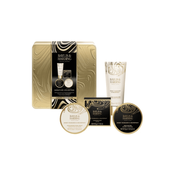 El diseño monocromático se combina con el lujo atemporal con nuestra perdurable colección Sweet Mandarin & Grapefruit. Nuestra fragancia más icónica, compuesta con elegante jazmín y superpuesta con brillantes notas altas cítricas, aporta una dimensión de lujo a este surtido clásico. La combinación de suaves curvas y contornos femeninos con una paleta monocromática y elegantes detalles metalizados crea magistralmente esta colección de temporada.Un set presentado en una lata de recuerdo con todos los elementos esenciales para consentirte, incluida una crema de ducha de 50 ml, una crema corporal de 50 ml, una crema de manos de 50 ml y un jabón de 50 g.