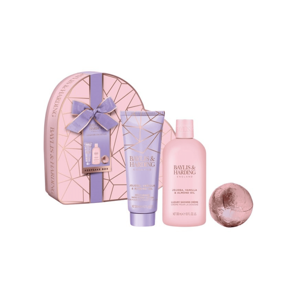 Mezclas femeninas de jojoba, rica vainilla y aceite de almendras dulces caracterizan esta hermosa y opulenta colección. Los sutiles rosas nude se combinan con el lavanda digital para realzar esta estética inspirada en la belleza astrológica. Femeninos y refinados, estos hermosos tonos de color están acentuados con láminas doradas geométricas para completar este look de lujo.Demuestre su cariño con esta hermosa caja de regalo de recuerdo en forma de corazón, el set contiene una crema de ducha de 300 ml, una loción para manos y cuerpo de 200 ml y una bomba de baño de 140 g.