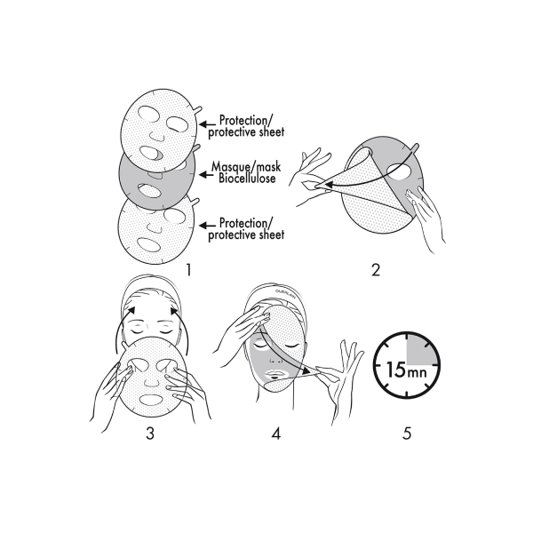 Aplicar la mascarilla por la mañana o por la noche en lugar del sérum habitual realizando el siguiente método de aplicación:limpiar la piel y aplicar la loción y la mascarilla realizando los movimientos que se muestran a continuación para una aplicación óptima.1) La mascarilla Honey Cataplasm Abeille Royale consta de 3 capas2) Abrir la mascarilla y retirar la primera lámina protectora3) Aplicar la mascarilla en el rostro4) Con la pestaña, retirar la segunda lámina protectora5) Dejar que la mascarilla actúe durante 15 minutos6) Retirar la mascarilla y realizar un masaje con el producto restante evitando la boca y el contorno de los ojos