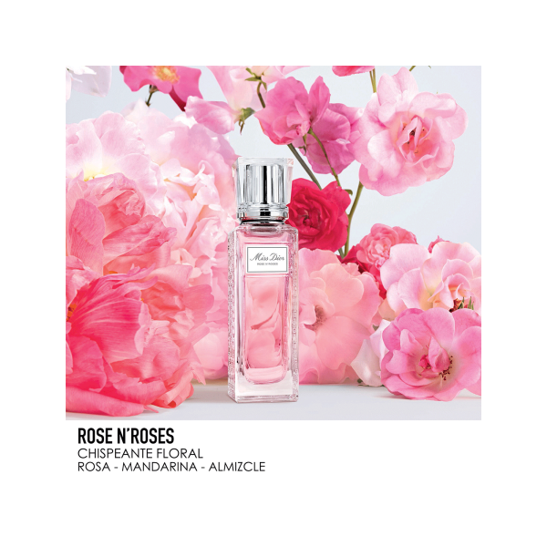Miss Dior Rose N'Roses se presenta en un delicado frasco fácil de llevar: Roller-Pearl. Discreto y elegante, este frasco de cristal está coronado por una perla cristalina que facilita una aplicación de perfume roll-on*, fácil y libre. Para los retoques, para renovar la aplicación o durante un viaje, Miss Dior Rose N’Roses Roller-Pearl es precioso como una joya. Miss Dior Rose N'Roses es una fragancia floral y chispeante, una profusión de rosas de Grasse refrescadas por la cáscara de bergamota y acentuadas por la intensidad de una nota de almizcle blanco. La vibrante esencia de geranio esculpe la composición con sus aromas cítricos para recrear, lo más fielmente posible, el irresistible olor de un campo de rosas de Grasse rebosante de flores. Una eau de toilette rosa vibrante para una fragancia fresca y chispeante. * Aplicador de bola.