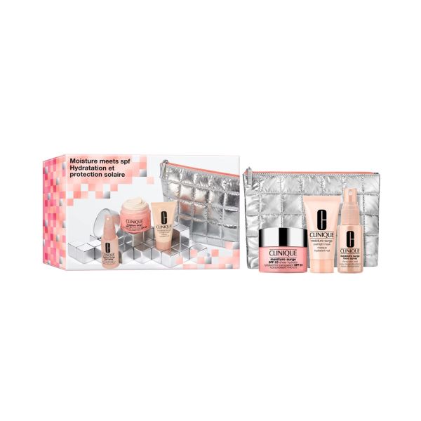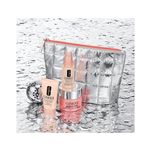 Mantente radiante con los tres favoritos para la hidratación, incluido nuestro hidratante favorito de los fans con SPF. A prueba de alergias. 100 % sin perfume. - Moisture Surge SPF 25 Sheer Hydrator es un hidratante ligero y cremoso que brinda hidratación más protección solar ligera, incluso para tonos de piel más profundos. Protege contra los rayos UVA/UVB y evita que el brillo del sol opaque el tuyo. - Máscara de noche Moisture Surge nutre mientras duermes. - Una pulverización de Moisture Surge Face Spray Thirsty Skin Relief repone la humedad de la piel en cualquier momento.