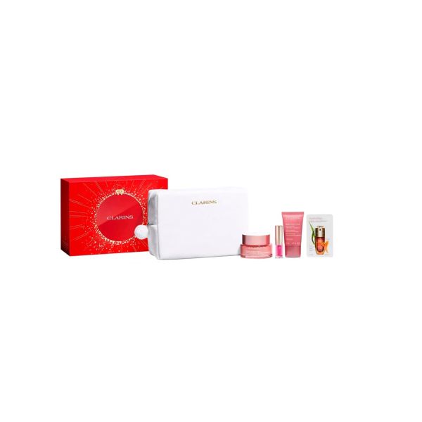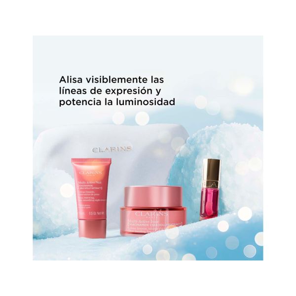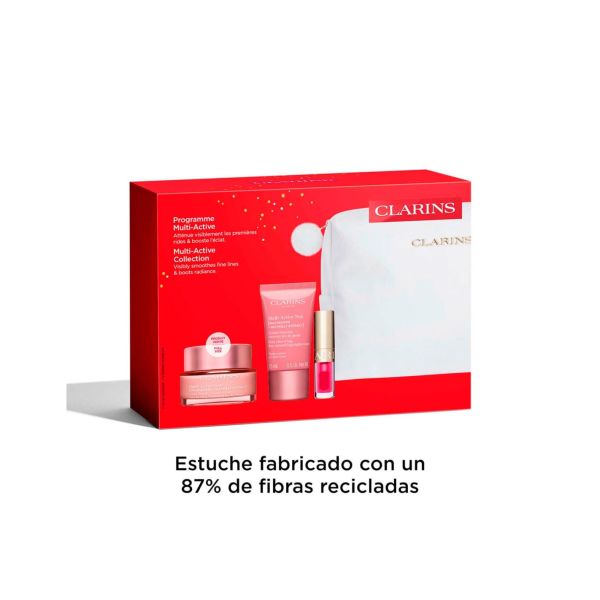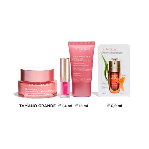 Este cofre reúne el ritual completo de tratamiento para las mujeres que desean atenuar la apariencia de las primeras arrugas. La crema Multi-Activa Día, formulada con un potente dúo [niacinamida + extracto de cardo marino], ayuda a reducir los primeros signos visibles de la edad. Para completar tu ritual, la crema Multi-Activa Noche favorece una piel radiante al despertar: la noche es el mejor momento para favorecer la renovación de la piel. Este ritual de tratamiento contribuye a hidratar la piel y a preservar su juventud. Sin olvidar el icónico Double Serum de nueva generación, tratamiento completo para combatir los signos de la edad, que ayuda a la piel a recuperar vitalidad y luminosidad. Un Lip Comfort Oil completa este ritual, un toque de belleza perfecto para realzar tus labios, brillantes y redensificados. Un bonito neceser con un 87% de fibras recicladas contiene estos productos. ¿Qué los hace tan especiales?- Atenúa visiblemente las primeras arrugas- Potencia la luminosidadEste cofre contiene:Multi-Active Día Crema para todo tipo de pieles - 50 ml- Crema alisadora y potenciadora de la luminosidad. Textura fundente. Enriquecida con [NIACINAMIDA + EXTRACTO DE CARDO MARINO]. Mini Lip Comfort Oil #04- Un nutritivo aceite con color para unos labios brillantes y realzados. Multi-Active Night Cream para todo tipo de pieles (15ml)- Enriquecida con cardo marino y niacinamida para prevenir y corregir los 8 signos de la edad acelerados por el estilo de vida. Neceser Navidad Clarins - Neceser pequeñoDouble Serum 9 Sach 0.9ml 2024- El concentrado antiedad más potente. Double Serum actúa sobre los signos de la edad relacionados con el envejecimiento natural, y por primera vez, ayuda a neutralizar el 100% de las causas biológicas del envejecimiento causadas por el estilo de vida.