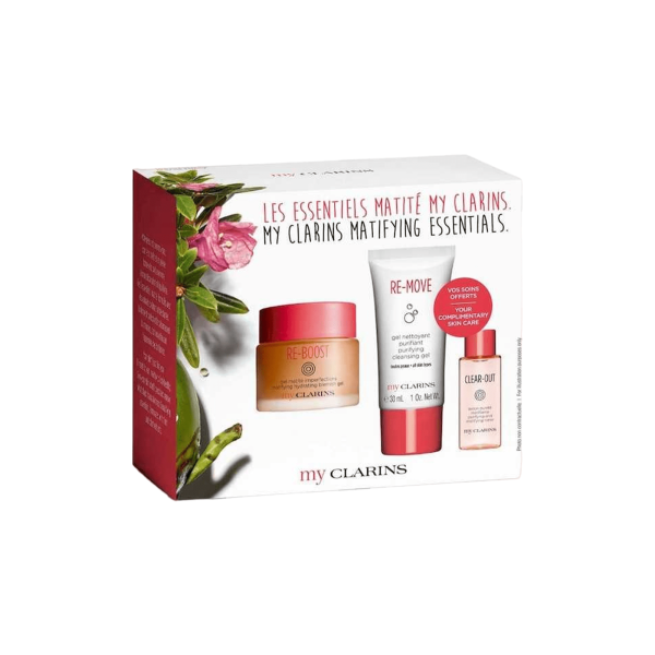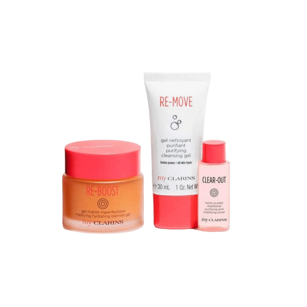 Este set contiene:- My Clarins Re-Boost Matifying Hydrating Belmish Gel 50ml- My Clarins Re-Move Purifying Cleansing Gel 30ml- My Clarins Clear-Out Purifiying And Matifying Toner 10mlEl gel con acabado mate para las imperfecciones absorbe el exceso de sebo, matifica la piel y controla los brillos.También reduce visiblemente las imperfecciones, purifica y elimina las impurezas. Alisa y afina la textura de la piel, aporta luminosidad y frescura a la piel, al mismo tiempo que la revitaliza.El "Healthy Skin [In&Out] Complex": agua de coco bio y extracto de rosa de los Alpes reequilibrante para una piel radiante de salud.Fórmula enriquecida con extractos de baya de goji bio potenciador de energía y de semilla de acerola para una piel cuidada , de higo bio con superpoder hidratante, de reina de los prados y de madroño bio para actuar visiblemente en las imperfecciones, los brillos y los poros. Los ácidos de la flor de Hibiscus sabdariffa y de la pulpa de tamarindo afinan la textura de la piel y el extracto de genciana amarilla bio calma y alivia la piel.Tu piel está matificada inmediatamente; y visiblemente menos grasa y luminosa.Día tras día, la textura de la piel está alisada y afinada; las zonas de brillos se atenúan y la piel está más bonita y en forma.