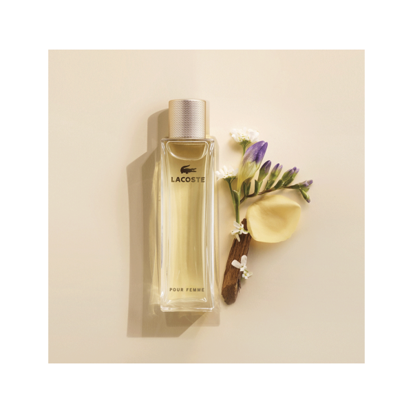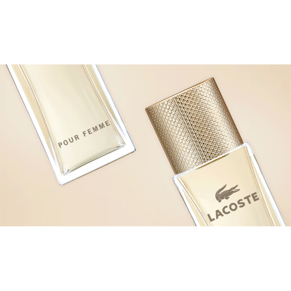 Lacoste Pour Femme es un elegante perfume floral almizclado que encarna el espíritu libre de las mujeres de hoy. Bellamente femenina, la fragancia es a la vez enérgica y estimulante. Notas Pimienta jamaicana, Fresia púrpura, Flor blanca de heliotropo, Jazmín iraní, Flor de hibisco, Rosa búlgara, Semilla de Ambrette, Madera de cedro del Himalaya y Sándalo Familia de fragancia Floral almizclado