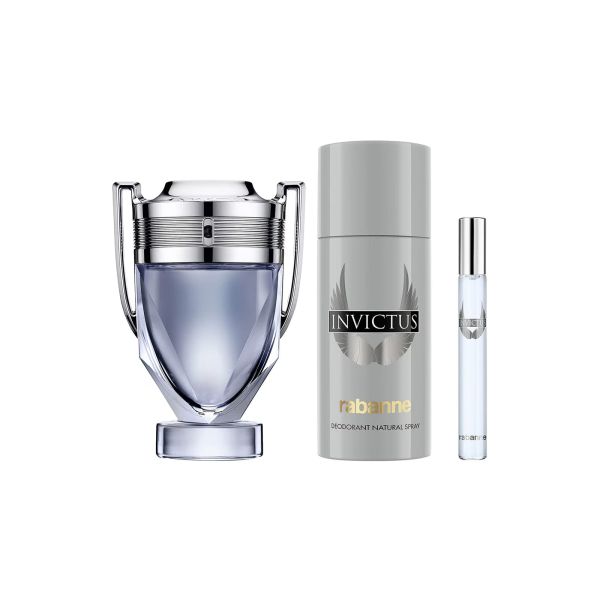 Este Día del Padre, Rabanne celebra a todos los padres que convierten cada momento en un tesoro de valor incalculable. Un set metálico de diseño ultra-couture inspirado en la moda de Rabanne. Una fragancia ganadora, fresca y amaderada. Con notas de pomelo y madera de guayaco, combinadas con la frescura cítrica de una fragancia sensual y temperamental. Invictus es más que una fragancia: es una declaración de victoria. Para el hombre imparable, con carisma de campeón y energía de leyenda. Esta Eau de Toilette encarna la tensión entre frescura explosiva y sensualidad magnética. Un choque de fuerzas que evoca poder, gloria y adrenalina pura. Un aroma que no se rinde. Que arrasa. Que gana. Este set contiene:- Invictus Eau de Toilette 100 ml - Desodorante en spray 150 ml - Invictus Eau de Toilette miniatura 10 ml