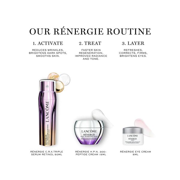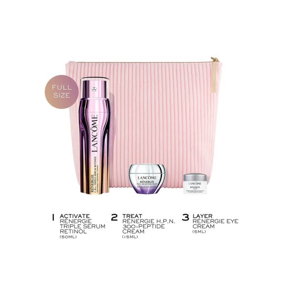 Déjese seducir por el lujoso set de regalo Lancôme Rénergie, una colección cuidadosamente seleccionada para realzar su rutina de cuidado facial. Este exquisito set reúne fórmulas de vanguardia que combaten los signos visibles del envejecimiento y realzan la belleza natural de su piel. El sérum Lancôme Rénergie CRx aprovecha el poder de tres potentes ingredientes activos, ofreciendo una triple eficacia. Por primera vez, experimenta los efectos transformadores del retinol puro, la vitamina C pura para iluminar y los péptidos X para calmar la piel. Este sérum avanzado actúa en sinergia para rejuvenecer tu piel, dejándola radiante y joven. Este set de regalo no solo es un capricho para ti, sino también un obsequio excepcional para tus seres queridos. Con su elegante empaque y productos de lujo, el Set de Regalo Lancôme Rénergie ofrece una experiencia de cuidado de la piel de primera calidad con resultados visibles. Transforma tu rutina y luce una tez más joven y radiante hoy mismo. El conjunto incluye:- Sérum Renergie CRx (50 ml): Un potente sérum para potenciar la vitalidad de la piel. - Crema de péptidos Renergie HPN 300 (15 ml): Infunde a la piel péptidos esenciales para una mayor firmeza e hidratación. - Renergie Eye (5 ml): Tratamiento específico para combatir las líneas de expresión y las ojeras. - Neceser de cosméticos Lancôme: Un accesorio elegante para guardar tus productos esenciales para el cuidado de la piel.