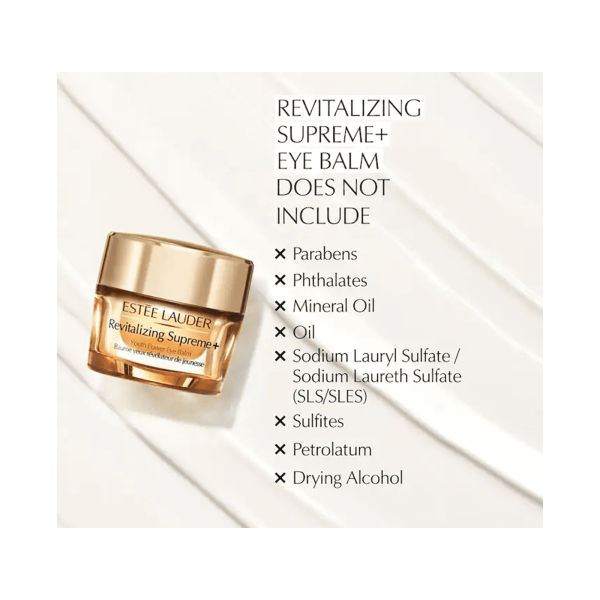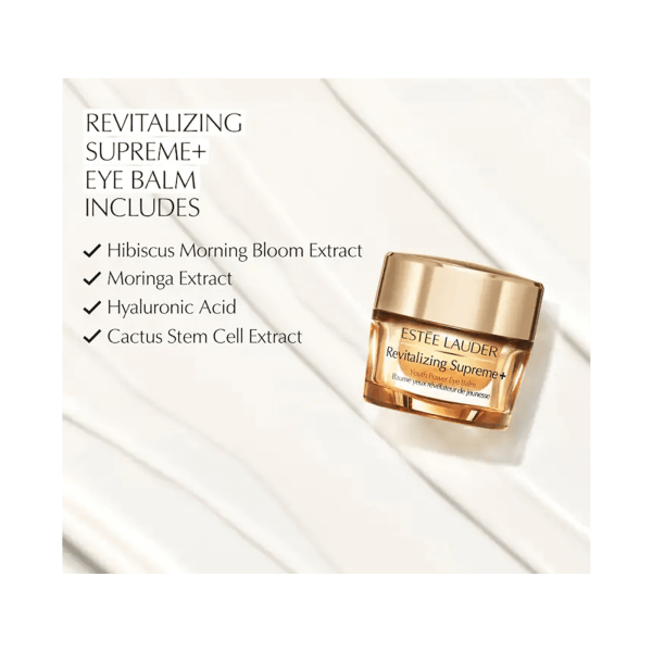 Todo en un contorno de ojos. Una piel joven, luminosa y firme.El contorno de los ojos se ve menos hinchado, más elevado y firme. Textura de bálsamo muy nutritiva. Con un 99% de Exclusivo Extracto de Flor de Hibisco y exclusivo Extracto de Moringa, hará que tu contorno de los ojos revele su potencial de juventud.Resultados:Este bálsamo altamente nutritivo mejora significativamente la firmeza y la elasticidad y el area de los ojos se ve menos hinchado y más elevado, restaura la luminodad, reduce el aspecto de las ojeras. Para un impulso adicional, también se puede utilizar como mascarilla semanal para los ojos.YOUTH POWER INGREDIENTSExclusivo Extracto de Flor de HibiscoLos científicos de Estée Lauder descubrieron la flor de hibisco de China se recoge específicamente de las flores por la mañana, cuando sus propiedades naturales antienvejecimiento están en su punto álgido. Se recolectan flores seleccionadas a mano por la mañana para obtener su máxima potencia, y luego -en un proceso que dura 83 días desde la cosecha hasta la fabricación- creamos nuestro extracto que ayuda a ayuda a la producción de colágeno natural de la piel.Exclusivo Extracto de Moringa:La planta Moringa (a menudo denominada ""árbol milagroso"" o ""árbol de la vida"") es conocida por su rico contenido nutricional. Nuestro proceso de extracción de Moringa, pendiente de patente, garantiza la conservación de los valiosos nutrientes, lípidos y proteínas para ayudar a proporcionar beneficios excepcionales a la piel. En nuestras fórmulas, el extracto de moringa ayuda a ""activar"" la capacidad de la piel para combatir las agresiones medioambientales que causan los signos visibles del envejecimiento.Extracto de Células Madre de Higo Chumbo y Ácido Hialurónico:Otros ingredientes de alto rendimiento se suman al poder de Revitalizing Supreme+. Ayudan a reforzar la barrera de hidratación de la piel y sellar la humedad, y el Ácido Hialurónico ayuda a hidratar y rellenar visiblemente la piel.Tecnología de Refuerzo del Colágeno: Nuestro característico complejo potenciador del colágeno contiene un potente trío de potenciadores de colágeno: Acetil hexapéptido-8, extracto de algas marinas y proteína de suero de leche que ayuda a la producción de colágeno natural de la piel.TEXTURA BÁLSAMO Y NUTRITIVATextura de bálsamo, muy nutritiva, amortigua y reconforta la piel del area de los ojos. Se absorbe rápidamente.IngredientesWater\Aqua\Eau, Methyl Trimethicone, Propanediol, Isododecane, Polyethylene, Dimethicone, Butylene Glycol, Hydrogenated Polyisobutene, Dimethicone/Vinyl Dimethicone Crosspolymer, Cetyl Peg/Ppg-10/1 Dimethicone, Stearyl Dimethicone, Nylon-12, Isononyl Isononanoate, Moringa Oleifera Seed Extract, Hibiscus Sinensis Flower Extract, Sodium Hyaluronate, Acetyl Hexapeptide-8, Laminaria Digitata Extract, Whey Protein\Lactis Protein\Proteine Du Petit-Lait, Opuntia Tuna Extract, Acetyl Glucosamine, Tocopheryl Acetate, Narcissus Tazetta Bulb Extract, Squalane, Hydrolyzed Rice Extract, Algae Extract, Limonium Vulgare Flower/Leaf/Stem Extract, Cucumis Sativus (Cucumber) Fruit Extract, Silybum Marianum (Lady'S Thistle) Extract, Mimosa Tenuiflora Bark Extract, Helianthus Annuus (Sunflower) Seed Extract, Sigesbeckia Orientalis (St. Paul'S Wort) Extract, Caffeine, Hordeum Vulgare (Barley) Extract\Extrait D'Orge, Triticum Vulgare (Wheat) Germ Extract, Propylene Glycol Dicaprate, Glucose, Magnesium Sulfate, Sucrose, Glycerin, Pinanediol, Camphanediol, Hexylene Glycol, Caprylyl Glycol, Boron Nitride, Maltodextrin, Aminopropyl Ascorbyl Phosphate, Methicone, Artemia Extract, Polysilicone-11, Alumina, Isoceteth-20, Disteardimonium Hectorite, Peg-10 Dimethicone, Lauryl Peg-9 Polydimethylsiloxyethyl Dimethicone, Citric Acid, Octadecene, Triethoxycaprylylsilane, Disodium Edta, Bht, Potassium Sorbate, Chlorphenesin, Phenoxyethanol, Titanium Dioxide (Ci 77891), Iron Oxides (Ci 77491)