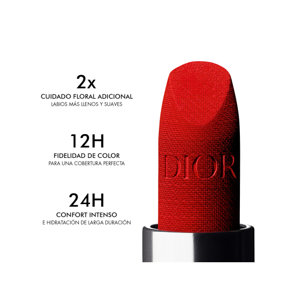 Rouge Dior, el ícono del maquillaje Dior, se presenta en un nuevo estuche contemporáneo y viene en una amplia gama de tonos y dos acabados para looks de maquillaje ilimitados. Rouge Dior, de larga duración, está enriquecido con un cuidado labial floral hidratante que proporciona 24 horas de comodidad. Auténtico accesorio de alta costura vestido con el estilo característico de Dior, el nuevo lápiz labial Rouge Dior está adornado con el emblemático motivo cannage y una banda de CD. Su tapa magnética se coloca y se quita con un simple paso. Las barras de labios de larga duración vienen en dos acabados de alta costura: el acabado aterciopelado mate tiene una textura suave y envolvente para unos labios carnosos y suaves. Sin comprometer la comodidad, estos lápices labiales aterciopelados tienen una sensación apenas visible que deja los labios carnosos y suaves. El bastón está decorado con un estampado inspirado en los tejidos Dior. El acabado de la barra de labios satinada tiene una textura cremosa que crea labios brillantes y bien formados. La piel aparece flexible y tersa, realzada por una intensa luminosidad y suavidad. BeneficiosDisponible en acabados de lápiz labial aterciopelado y satinado, Rouge Dior cuenta con una fórmula con un cuidado de labios dos veces más floral para una comodidad intensa. Estos lápices labiales de larga duración garantizan 12 horas de color verdadero para un resultado uniforme y duradero con una cobertura perfecta. Los labios lucen carnosos y suaves, realzados con un efecto suave y mate para el acabado aterciopelado y un efecto brillante y cremoso para el acabado satinado.