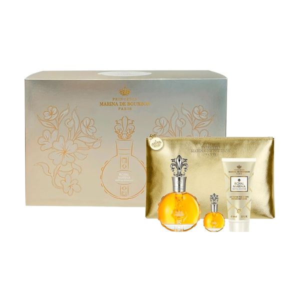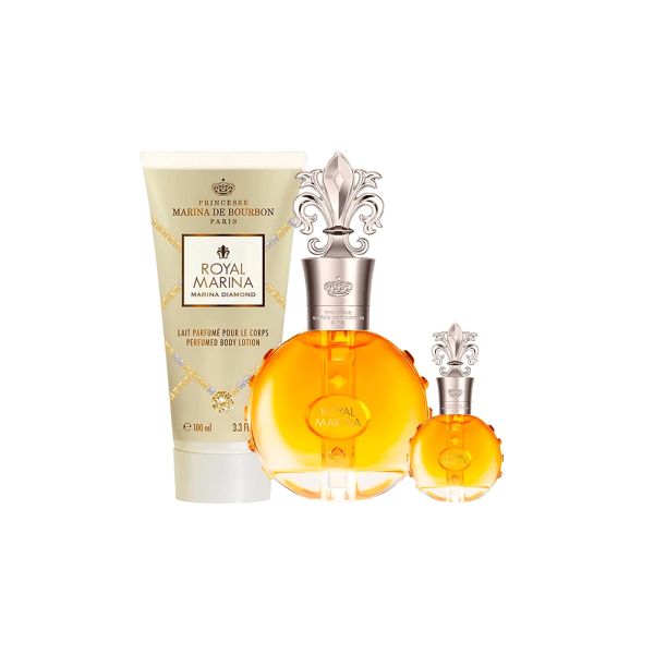 El Kit Marina De Bourbon Royal Diamond Eau De Parfum 100ml + Eau De Parfum 7.5ml + Body Lotion 100ml + Toiletry Bag Es un lujoso set que celebra la elegancia y el esplendor de la realeza francesa. Creado por la marca Marina de Bourbon, fundada por la Princesa Marina de Bourbon Parme, este kit refleja la sofisticación de las Joyas de la Corona, con un intenso y misterioso aroma floral oriental. El kit incluye un Eau de Parfum de 100ml, una miniatura de 7,5ml, una Loción Corporal de 100ml y un exclusivo neceser, ideal para regalar o para quienes buscan una experiencia sensorial completa. Inspirado en el brillo de los diamantes y el glamour de Versalles, Royal Diamond es perfecto para mujeres seguras y seductoras, ideal para cálidas noches de verano, cenas románticas o eventos especiales. Ingredientes principales:- Eau de Parfum: pomelo, baya de acai, iris, haba tonka, jazmín sambac, vainilla, almizcle, copaiba. - Loción Corporal: Glicerina, Dimeticona, fragancia con notas de baya de açaí, iris, vainilla. - Eau de Parfum (100ml y 7,5ml): Pulverizar sobre los puntos de pulso (muñecas, cuello, pecho) a 15-20 cm de distancia para una mejor proyección. Evitar frotar para conservar las notas olfativas. - Loción Corporal (100ml): Aplicar sobre la piel limpia y seca después del baño, masajeando suavemente hasta su completa absorción, para hidratar e intensificar la fragancia. Componentes del kit:Eau de Parfum 100ml: Fragancia principal para uso diario u ocasiones especiales. Eau de Parfum 7,5ml: Miniatura ideal para bolsos o viajes. Loción Corporal 100ml: Loción hidratante con la misma fragancia. Neceser: Elegante, para guardar productos o artículos personales.