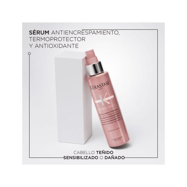 Sérum térmico antiencrespamiento para todos los cabellos coloreados, sensibles o dañados. Su textura láctea con propiedades antioxidantes, enriquecida con ácido láctico y Centella asiática, ayuda a preservar el color protegiendo la fibra capilar de las múltiples agresiones externas: daños causados por los rayos UV, la humedad, el calor y el estrés oxidativo.Beneficios del productoEsta fórmula hidratante cuida el cabello teñido a la vez que lo protege intensamente contra las múltiples agresiones externas: daños causados por los rayos UV, la humedad, el calor y el estrés oxidativo.Hidrata el cabello hasta un +96 %* y reduce la porosidad para mantener el color durante más tiempoProtege contra la humedad para un 77 % menos de encrespamiento*** Protege el cabello y el color de los cambios de estrés oxidativo con ricas propiedades antioxidantesProtección térmica a 230°CIngredientes principalesÁcido lácticoEste ácido cicatrizante ayuda a crear una película lipídica en la superficie del cabello para darle más brillo.Centella AsiáticaUna antigua planta regenerativa conocida por sus propiedades cicatrizantes.