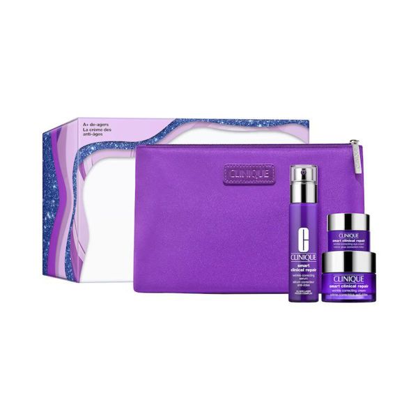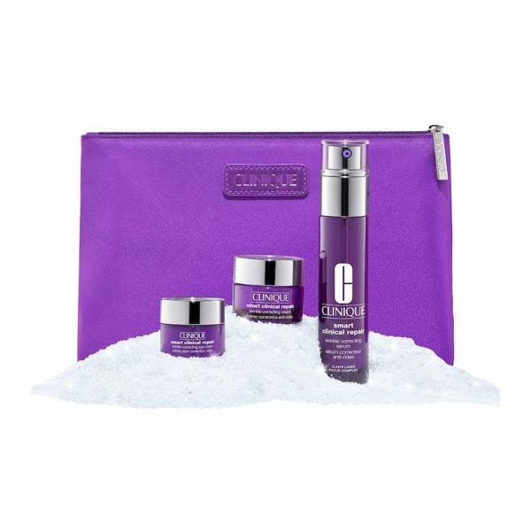 Clinique Smart Clinical Repair™ Wrinkle Correcting Serum, suero desarrollado por dermatólogos y clínicamente probado que ataca las líneas de expresión y arrugas en el rostro desde 3 ángulos distintos.Clinique Smart Clinical Repair™ Wrinkle Correcting Cream, humectante que fortalece y nutre la piel, ayudando a suavizar visiblemente las líneas y arrugas.Clinique Smart Clinical Repair™ Wrinkle Correcting Eye Cream, fórmula avanzada para reducir líneas de expresión y arrugas de la zona de los ojos. El Set Incluye: • Sérum corrector de arrugas Clinique Smart Clinical Repair™ tamaño de venta, 30 ml • Crema correctora de arrugas Clinique Smart Clinical Repair™, 15 ml • Contorno de ojos Clinique Smart Clinical Repair™, 5 ml