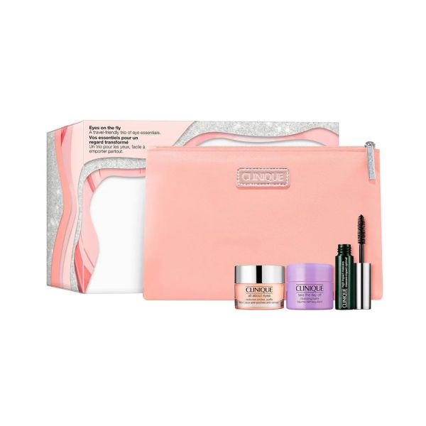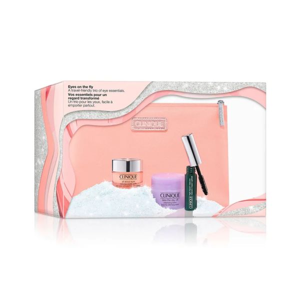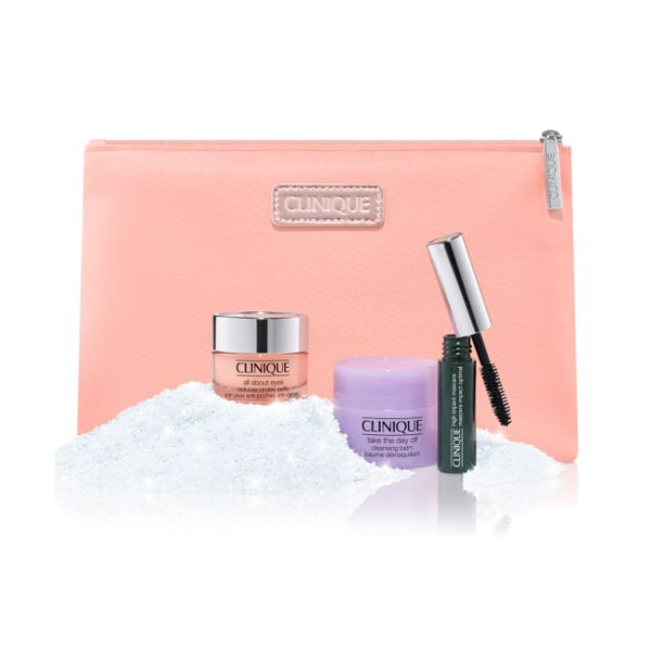 Un kit de edición limitada con 3 productos esenciales para los ojos que le aportan a tu mirada un toque de frescura y luminosidad en cualquier momento del día. Es perfecto para reducir la apariencia de ojos hinchados, crear unas pestañas con volumen intenso y desmaquillar sin riesgo alguno a la zona de los ojos. Es ideal para llevar de viaje. Este kit incluye:- Contorno de Ojos All About Eyes (Tamaño Regular, 15 ml): Una crema de ojos liviana que disminuye la apariencia de bolsas y ojeras. Ayuda a que el maquillaje dure más tiempo y evita que se cuartee.- Mini Pestañina High Impact Mascara (Tamaño Mini, 3.5 ml): Una pestañina con un drama instantáneo para las pestañas! Define, da volumen y longitud en cada una de las pestañas.- Mini Desmaquillante Take The Day Off Cleansing Balm (Tamaño Mini, 15 ml): Un desmaquillante de ojos y piel con una suave fórmula en bálsamo que cuando se aplica se transforma en aceite! Remueve eficazmente el maquillaje, limpiando profundamente y eliminando los restos de contaminación de la piel.