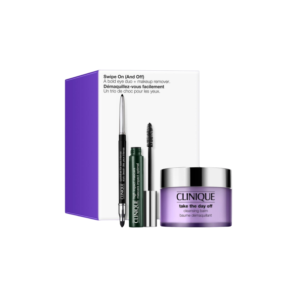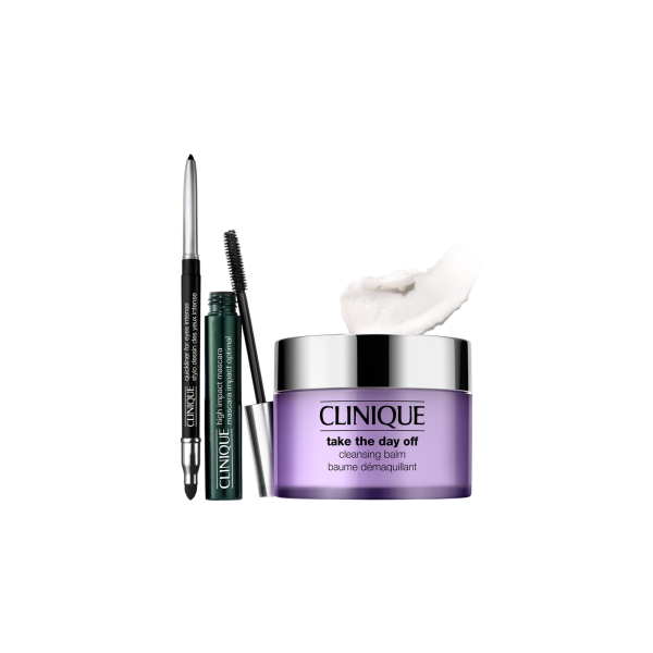 ¿Para quién es? Todos los tipos de piel.¿Lo qué es?Un dúo atrevido de maquillaje de ojos y desmaquillante.¿Qué hace?Afronta el día con una mirada atrevida y luego derrítelo todo. High Impact™ Mascara aumenta el volumen y la longitud de todas y cada una de las pestañas. Quickliner™ For Eyes Intense se desliza para lograr un color intenso. El bálsamo limpiador Take The Day Off™ se transforma en un aceite sedoso que elimina incluso el maquillaje más tenaz. En tamaño jumbo. El juego incluye Bálsamo limpiador Jumbo Take The Day Off™, 6,76 oz/200 ml Máscara de pestañas High Impact™ de tamaño completo en negro, 0,28 oz/7 ml Quickliner™ para ojos intenso de tamaño completo en negro intenso, 0,01 oz/0,25 g Libre de Sin parabenos, sin ftalatos, sin fragancia