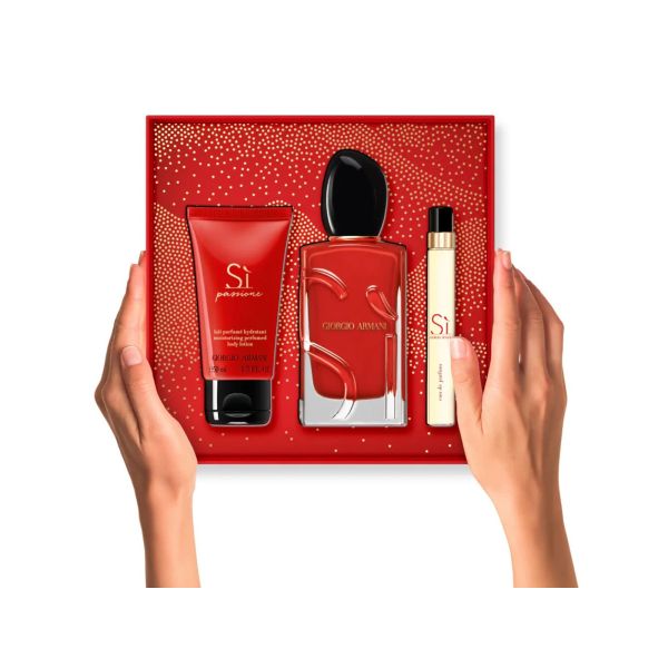 Para estas fiestas, sigue las perlas mágicas y descubre regalos de belleza únicos de Armani. Abre tu caja de regalo de Armani y déjate cautivar por los íconos inimitables. Este perfume de Giorgio Armani se adapta con naturalidad al día y a la noche, adaptándose a diversos ambientes. Es ideal tanto para ocasiones informales como formales y especiales. Sì Passione reitera la firma clave de Sì: néctar de Jungle Essence de grosella negra, combinado con una pera chispeante y alegre. Se agrega vainilla intensa a las flores de rosa, heliotropo y jazmín para crear un aroma floral sensual y afrutado. En el corazón de Sì Passione se encuentran la madera de cedro y el moderno Orcanox ambarado-amaderado. Elaborado con un savoir-faire único en fabricación de vidrio, el nuevo frasco joya está adornado con el logotipo rojo tono sobre tono de Sì, grabado en relieve en el vidrio. Es una declaración contundente que invita a cada mujer a decir sí. El precioso frasco está diseñado para durar, es rellenable y reciclable. El set de regalo de Armani es un regalo de alta costura, elaborado con meticulosa atención al detalle, con papel de primera calidad y adornado con estampado dorado en caliente. Diseñados con una visión de lujo consciente, los sets están completamente libres de plástico y hechos para durar. La caja roja, bellamente decorada, está diseñada para ser guardada y reutilizada. Composición de la fragancia:- Notas de salida: néctar de grosella negra, pera, pimienta rosa- Notas de corazón: rosa, absoluto de jazmín- Notas de fondo: vainilla, madera de cedroEl set contiene:- Sì Passione Eau de Parfum 100 ml- Sì Passione Eau de Parfum 10 ml spray de viaje- Sì Passione Eau DE Parfum 50 ml loción corporal