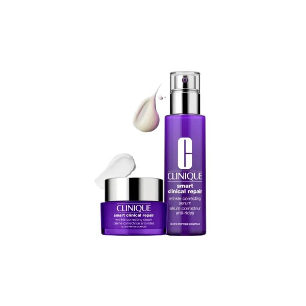Dos de nuestras mejores fórmulas para combatir la apariencia de líneas y arrugas. - Suero corrector de arrugas Clinique Smart Clinical Repair de tamaño completo, 1,7 oz/50 ml - Crema correctora de arrugas Clinique Smart Clinical Repair de tamaño completo, 1,7 oz/50 ml ¿Qué es? Un dúo antienvejecimiento con un potente suero y un humectante que combate las arrugas para una piel más suave y de aspecto más joven. ¿Qué hace? • Estos dos expertos en antienvejecimiento superan la apariencia de líneas y arrugas con la ayuda de potentes ingredientes que incluyen péptidos fortificantes y ácido hialurónico. • Clinique Smart Clinical Repair Wrinkle Correcting Serum, con la ayuda de un retinoide avanzado, fortalece y rejuvenece la piel para reducir la apariencia de líneas y arrugas. Lo suficientemente suave como para usarlo dos veces al día. • Clinique Smart Clinical Repair Wrinkle Correcting Cream reduce visiblemente las arrugas a medida que hidrata.