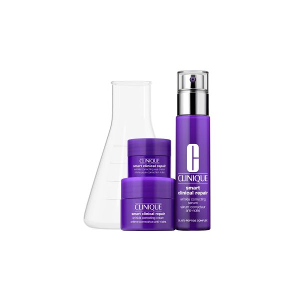 Luce más joven y con una piel visiblemente más suave con nuestros favoritos antiedad de nuestra famosa Skin School. El Set Incluye: - Sérum corrector de arrugas Clinique Smart Clinical Repair™ corrige visiblemente las líneas y arrugas con múltiple acción. La fórmula rica en péptidos ayuda a reparar, renovar y rellenar visiblemente la piel. - Crema correctora de arrugas Clinique Smart Clinical Repair™ hidrata profundamente y ayuda a fortalecer la piel para reducir visiblemente las líneas de expresión y arrugas. - Crema correctora de arrugas para ojos Clinique Smart Clinical Repair™ ayuda a suavizar y fortalecer visiblemente el área delicada alrededor de los ojos.