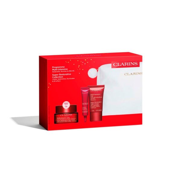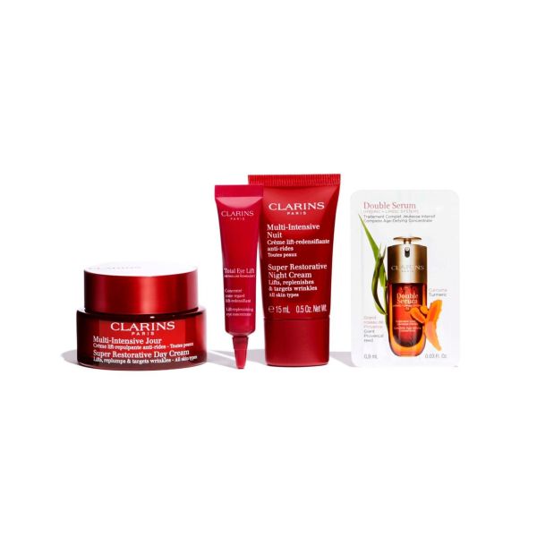 Este cofre de tratamientos redensificantes responde a las pieles afectadas por los cambios hormonales relacionados con la edad: descubre la crema Multi-Intensiva Día redensificante con extracto de harungana. La piel del rostro parece más densa, sus contornos parecen redefinidos y las arrugas se alisan visiblemente.Al completar un ritual de belleza, Multi-Intensiva Noche favorece la luminosidad de la piel al despertar. Para la mirada, el nuevo Total Eye Lift de efecto lifting ayuda a alisar y redensificar el contorno de los ojos. El icónico Double Serum de nueva generación, indispensable y para un tratamiento rejuvenecedor completo, actúa sobre todos los signos de la edad: arrugas visiblemente alisadas, una piel reafirmada, tersa y más luminosa. Incluso la textura de la piel mejora y se afina, los poros se atenúan. Un bonito neceser con un 87% de fibras recicladasEste cofre contiene:- Multi-Intensiva Día para todo tipo de pieles - 50mlCrema de día que redensifica y reafirma la piel. - Total Eye Lift trial size 7mlTransforma tu mirada con un efecto lifting en 30 segundos* gracias al contorno de ojos más completo. - Multi-Intensiva Noche 15mlCrema de noche que recupera la densidad de la piel. - Double Serum 9 Sach 0.9ml 2024El concentrado antiedad más potente. Double Serum actúa sobre los signos de la edad relacionados con el envejecimiento natural, y por primera vez, ayuda a neutralizar el 100% de las causas biológicas del envejecimiento causadas por el estilo de vida. - Neceser Snow Clarins