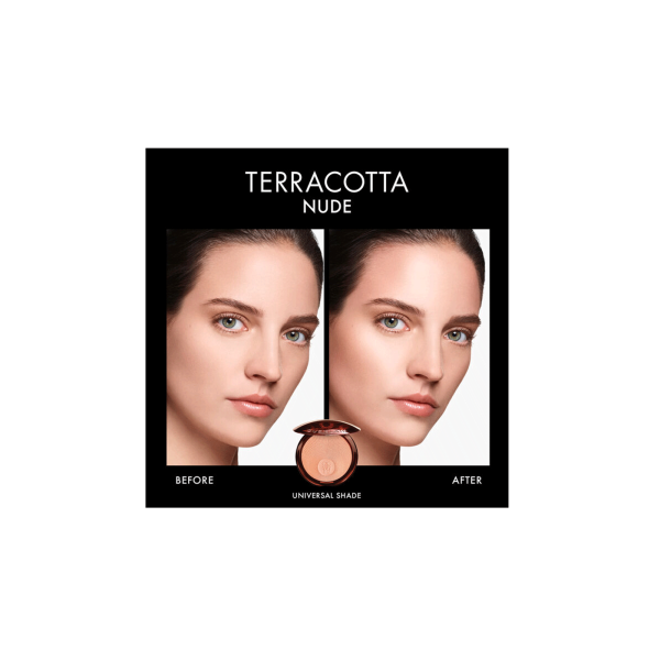 Como un rayo de sol matinal, puro y luminoso.Los polvos Terracotta Nude son un delicado velo iluminador que se fusiona con la tez. Su textura ligera alisa la piel y activa su luminosidad al instante en tan solo dostoques , para un efecto piel desnuda naturalmente cálida, con un resultado único para cada mujer.Terracotta Nude está disponible en un tono universal que se adapta a todas las tonalidades de piel gracias a un ingrediente camaleónico: el Gemnude Light. Su transparencia y su exclusiva tonalidad le permiten fundirse naturalmente con todos los tonos de piel, para revelar su belleza natural y unificar la tez.FraganciaEl perfume de los polvos Terracotta Nude invita a la evasión. Las notas de ylang ylang y flor de naranjo envuelven en una agradable sensación. Se acompañan de notas de haba tonka y vainilla con soleadas facetas que encarnan la esencia de Terracotta. Un toque de almizcles blancos aporta dulzura a esta fragancia adictiva. Los sentidos se despiertan en lugares lejanos.IngredientesEl Gemnude Light es un ingrediente verdaderamente camaleónico presente en el corazón de la fórmula que, gracias a su transparencia, está perfectamente calibrado para fundirse naturalmente con todos los tonos de piel. Su exclusiva tonalidad permite unificar la tez y envolverla con un velo luminoso universal, que revela la belleza natural de todos los tonos de piel.Enriquecida con activos hidratantes, su fórmula preserva la hidratación natural de la piel para asegurar un confort de larga duración.Unos polvos laminares forman una película ultrafina y respetan el acabado natural de cada piel, adaptándose perfectamente a las áreas con relieve del rostro. Su aplicación es infalible, sin riesgo de manchas.La promesa de una tez naturalmente radiante todo el año..Tipo de PielNormal, Seca, Grasa, Mixta, Sensible, Madura