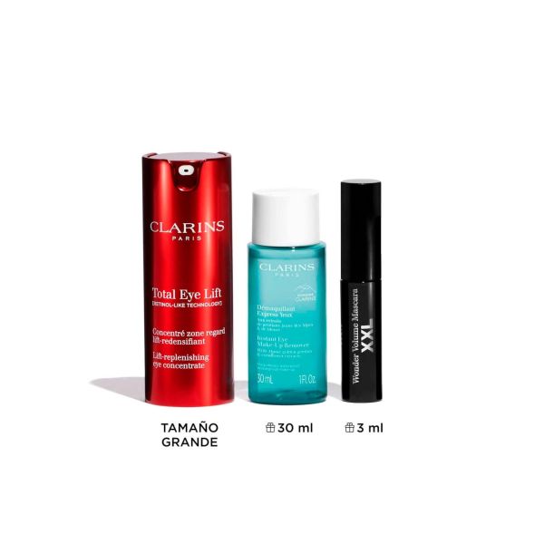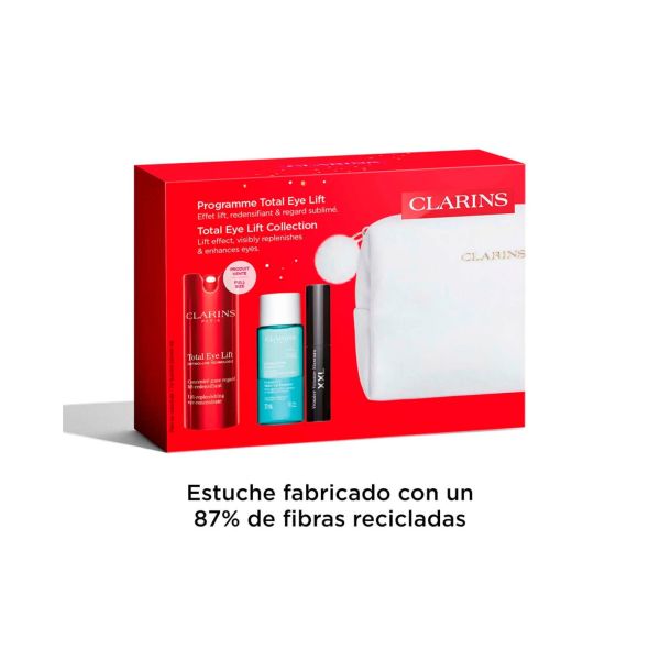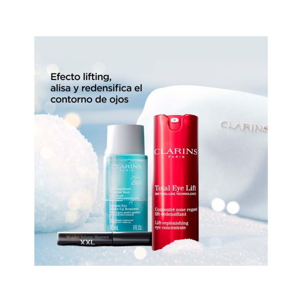 Este estuche reúne 3 productos expertos de la mirada. En primer lugar, el nuevo Total Eye Lift: este tratamiento con [TECNOLOGÍA RETINOL-LIKE] concentra todo el poder del extracto de harungana, activo exclusivo de Clarins. Su nueva fórmula PRO-TIGHTENING MATRIX forma una red tensora sobre la piel para un efecto lifting instantáneo. Su nuevo formato ecorresponsable y recargable es la marca de nuestro compromiso con una belleza más sostenible. Descubre nuestra icónica máscara de pestañas efecto volumen XXL para conseguir una mirada sublime. Una mirada extranegra y una larga duración, con cada aplicación, las pestañas ganan en intensidad y grosor y quedan impregnadas de tratamiento de la raíz a las puntas. Y, por último, el desmaquillante exprés bifásico ultraeficaz elimina las impurezas y el maquillaje rápidamente y con suavidad. Un bonito neceser con un 86% de fibras recicladas contiene estos productos. ¿Qué los hace tan especiales? - Efecto lifting- Redensificante- Mirada sublimadaEste cofre contiene:Total Eye Lift - 15ml- Transforma tu mirada con un efecto lifting en 30 segundos* gracias al contorno de ojos más completo. Instant Eye Make Up Remover Trial Size 30ml- El desmaquillante para ojos bifásico que elimina suavemente el maquillaje resistente al agua. Wonder Volume XXL 01 Miniature- Máscara de pestañas que aporta volumen al instante e incluso con las pestañas al natural. Neceser Snow Clarins - Neceser pequeño