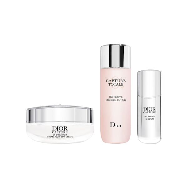 Dior Capture Trio - loción, sérum y crema de día - edición limitadaPara la temporada navideña, el ritual de cuidado facial correctivo antiedad de alto rendimiento Dior Capture se presenta en una bolsa brillante de edición limitada, con las iniciales CD adornadas con la estrella de la suerte de Monsieur Dior. Este set Dior Capture contiene 3 productos del ritual de cuidado facial de alto rendimiento, para una piel más firme, arrugas visiblemente reducidas y una luminosidad radiante. La rutina de cuidado facial incluye: - Capture Totale Lotion Essence Intense, 50 ml. Esta loción facial Dior prepara la piel para el ritual de cuidado facial realzando su luminosidad y llenándola visiblemente gracias a una fórmula enriquecida con un dúo de ácidos hialurónicos. - Dior Capture Le Sérum, 10 ml. Este sérum Dior para rostro y cuello presenta la tecnología OX-C Treatment con poder regenerador y rellenador, extracto de lirio revitalizante y un dipéptido con propiedades densificantes. Tras la aplicación, el sérum ofrece a la piel un efecto tensor inmediato. - Dior Capture Day Cream, 50 ml. Etapa esencial del ritual de tratamiento Dior Capture, esta crema antiedad para rostro y cuello con poder regenerador y rellenador actúa sobre las arrugas y estimula la producción de colágeno gracias a la tecnología OX-C Treatment, para un efecto reafirmante y redensificante instantáneo y una piel visiblemente más joven y firme.