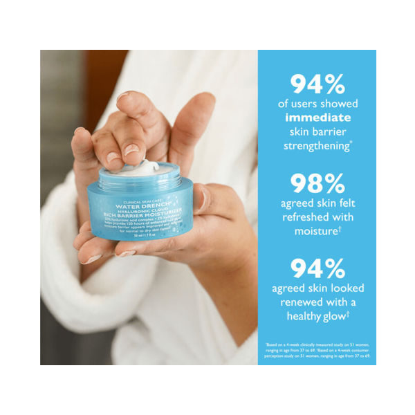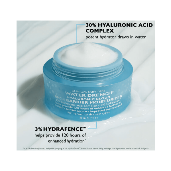 Es un humectante que proporciona una barrera de defensa mejorada y humecta la piel. Un innovador Moisture Barrier Boosting Complex ™ ayuda a aumentar el grosor, la firmeza y la elasticidad de la piel para combatir los efectos de sequedad y angustia de los deshidratadores externos. Un complejo de ácido hialurónico al 30 % atrae agua y ayuda a rellenar el aspecto de la piel con humedad, mientras que el 2 % de BioWave ayuda a mejorar el factor de hidratación natural (NMF) de la piel y previene la pérdida de humedad en el futuro. 3% HydraFence ™ ayuda a proporcionar 120 horas de hidratación mejorada. La apariencia de sequedad, líneas finas y arrugas se reduce visiblemente. La rica crema hidratante se seca con un acabado luminoso y un brillo saludable y juvenil. Sin perfume.