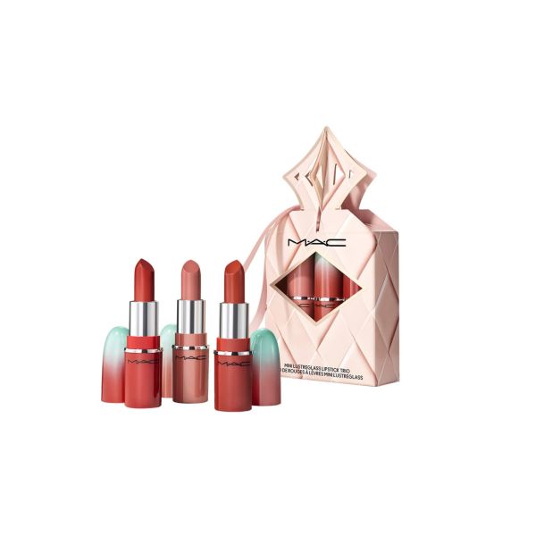 Para quien lo romantiza todo... Haz realidad tus brillos más salvajes con este trío de barras de labios mini Lustreglass Sheer-Shine Lipstick de regalo de edición limitada en ondas de color Nude y Bright, cada una con tres tonos más vendidos. Nuestra fórmula de Lustreglass Sheer-Shine Lipstick es el epítome del lujo diario: aporta color transparente y brillante con un acabado brillante y de larga duración. Listo para regalar en un envase exclusivo para las fiestas a un precio M·A·Cnífico. Un trío de labiales para regalo, exclusivo para estas fiestas, con una Lustreglass Sheer-Shine Lipstick en tamaño mini en los tonos más vendidos Nude y Bright a un precio M·A·Cnífico. El set de regalo incluye:3 Mini MAC Lustreglass LipstickTonos- Mini MAC Lustreglass Lipstick: Spice It Up (baya marrón) - Mini MAC Lustreglass Lipstick: Thanks, It's MAC\! (nude rosa grisáceo con perla) - Mini MAC Lustreglass Lipstick: Business Casual (nude rojo cálido) Beneficios:- Proporciona hidratación inmediata y a largo plazo- Acondiciona los labios al instante y con el tiempo- Los labios lucen visiblemente más voluminosos y saludables al instante- Ayuda a que los labios se sientan más suaves, tersos y flexibles- Color de larga duración, 8 horas- Brillo de larga duración, 6 horas- Cobertura ligera y modulable- Fórmula cómoda- Sensación ligera